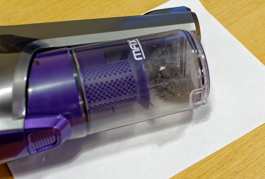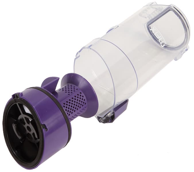 Прозрачный корпус пылесборника позволяет оценить степень его заполнения с первого взгляда, по крайней мере, пока он несильно поцарапался изнутри. Производитель указывает, что объем пылесборника равен 0,5 л, но это полный объем. Мы налили воды до отметки Max и, вылив, измерили ее объем — он был равен 275 мл. Дно пылесборника откидывается вниз, его можно опорожнить даже не отсоединяя от пылесоса. Циклон просто вынимается из пылесборника, он никак не закреплен. Пылесборник отсоединяется от моторного блока с помощью находящейся на нем фиолетовой защелки.