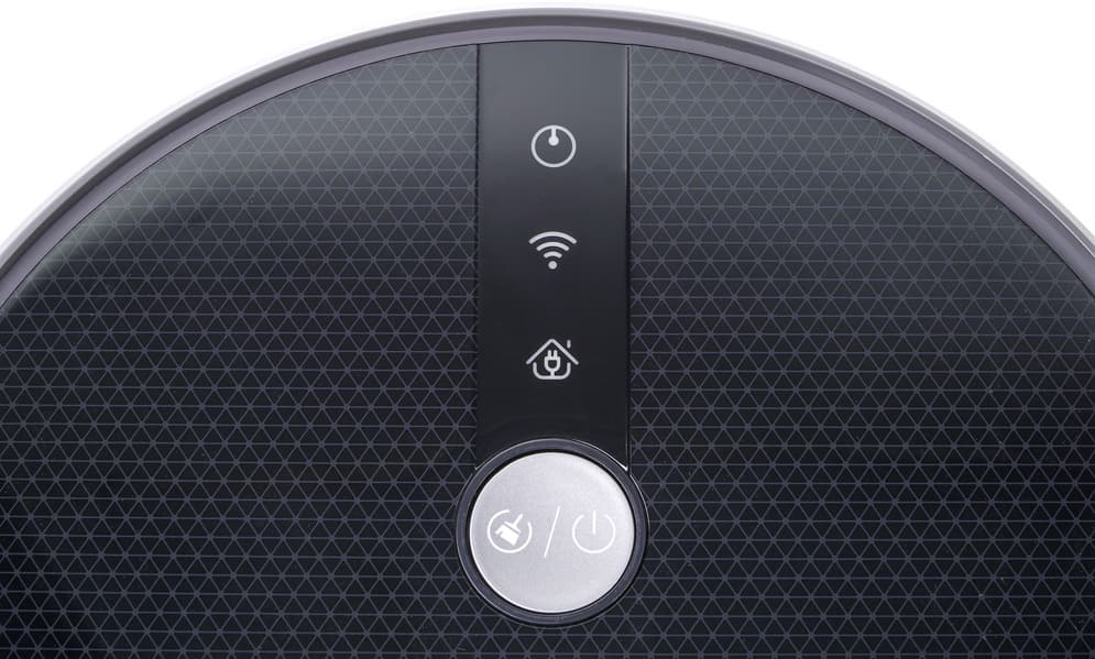 Рядом с кнопкой имеются три индикатора: работы (при включенном пылесосе горит зеленым), сетевой активности (горит зеленым при активном соединении с сервером, мигает при подключении к сети) и «База» (горит зеленым при полностью заряженном устройстве, мигает зеленым в процессе зарядки и горит оранжевым во время поиска базы и при движении к ней).