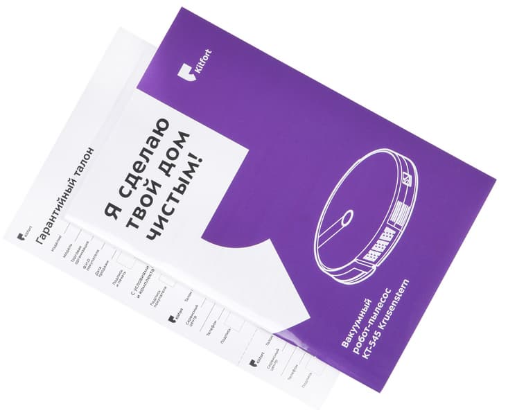 Руководство пользователя пылесоса оформлено в едином для компании Kitfort стиле: брошюра формата А5 со схематическим изображением прибора, логотипом компании, названием модели и слоганом «Я сделаю твой дом чистым!» (этот слоган маркетологи компании используют для всех моделей своих бытовых пылесосов).