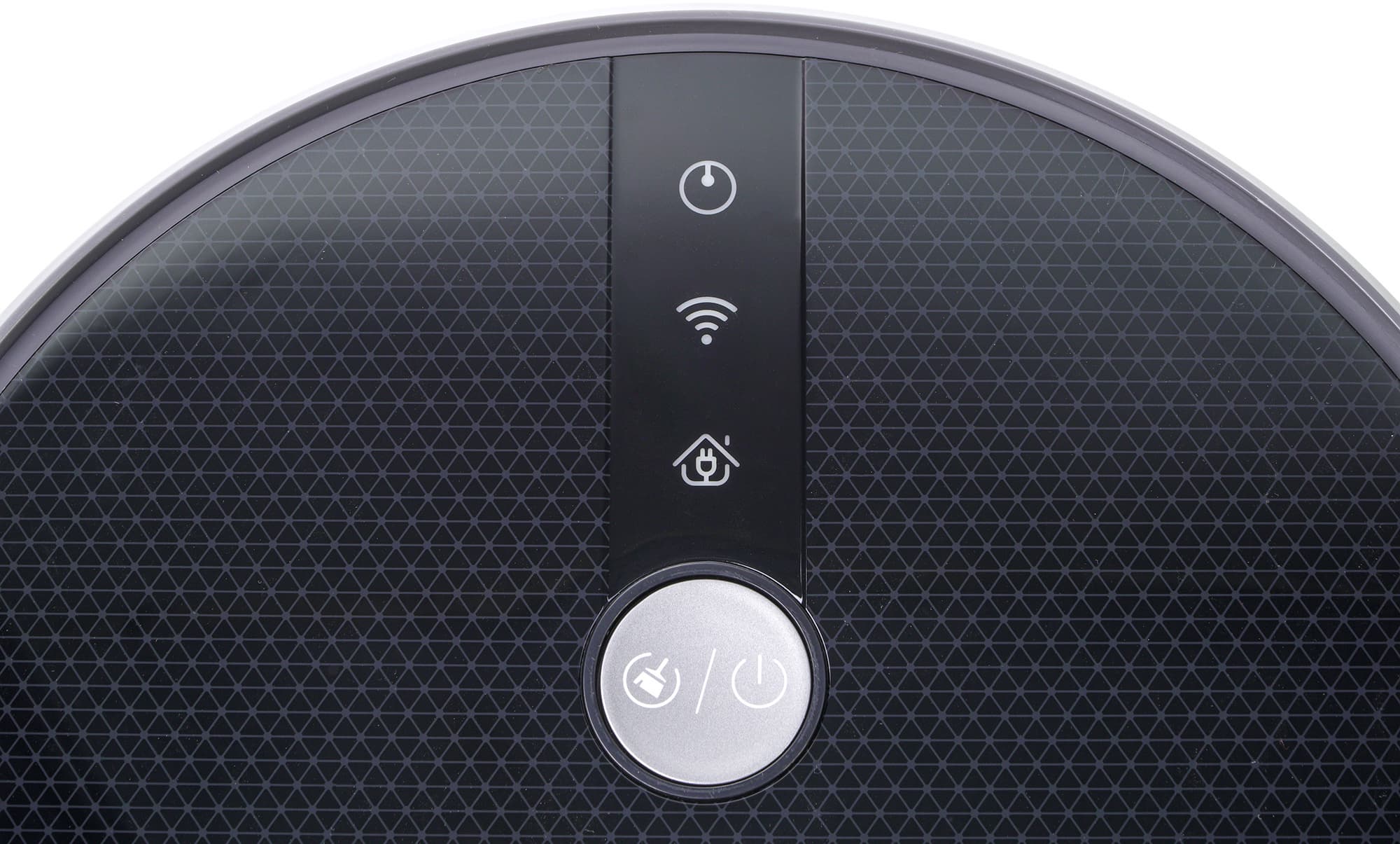 На верхней панели расположена многофункциональная кнопка «Старт». Ее длительное (5 секунд) нажатие включает или выключает пылесос. Коротким нажатием включается автоматический цикл уборки (повторное ставит уборку на паузу), а если нажать дважды, то запустится процедура регистрации устройства в сети Wi-Fi.