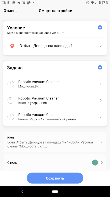 В настройках умного дома Smart Life можно прописать и более гибкие сценарии: к примеру, запускать пылесос только тогда, когда хозяин покинет помещение или, наоборот, появится в нужном месте. Но эта функциональность, на наш взгляд, еще сыровата, требует доработки и локализации: часть пунктов меню — на английском языке, часть — на китайском, а выбор из двух пунктов «Вкл.» и «Вкл.» заставил нас задуматься. Однако методом проб и ошибок мы все-таки смогли настроить запуск уборки в зависимости от изменения геопозиции владельца и убедиться в его работоспособности.