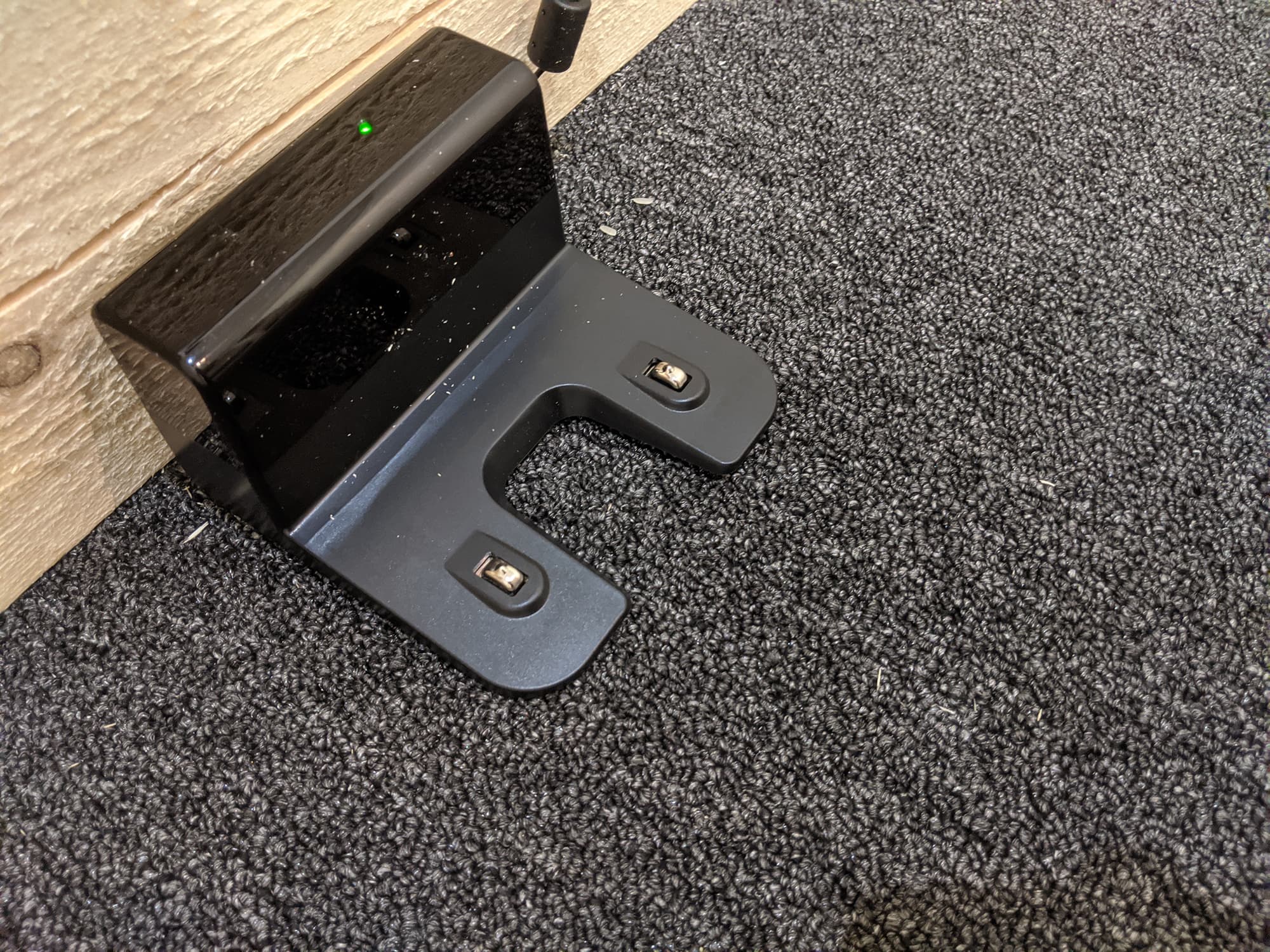 Верхняя часть базы выполнена из ИК-прозрачного пластика, под которым скрываются датчики, обеспечивающие позиционирование пылесоса при возвращении на зарядку. Там же находится зеленый светодиод, который сигнализирует о ходе пополнения батареи. На нижней части есть два контакта, которые, собственно, и обеспечивают протекание тока к аккумулятору.