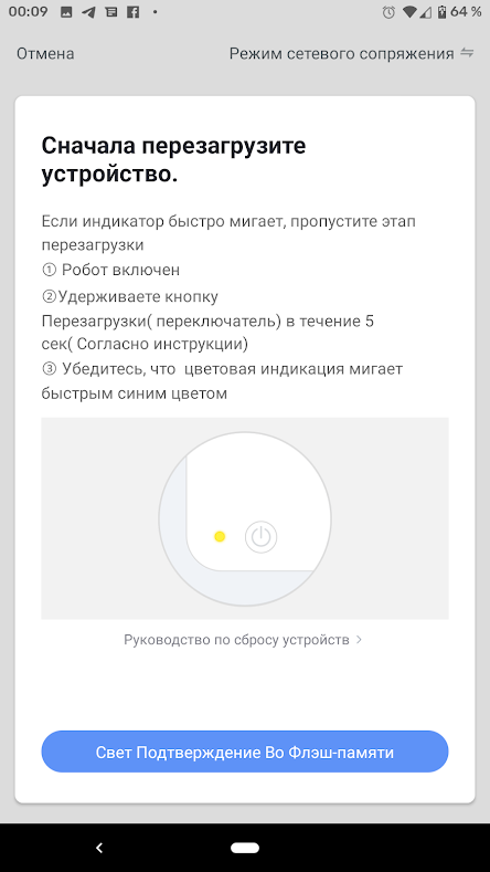 Для регистрации нового устройства в приложении рекомендуется удерживать нажатой кнопку включения на нем. Но этот способ не сработал. Тогда мы открыли инструкцию от Kitfort KT-545 и прочитали, что для регистрации кнопку включения надо нажать дважды на активном приборе. Поэкспериментировав с интервалом нажатия (он, как выяснилось, должен быть очень кратким), мы успешно добавили пылесос в умный дом и открыли настройки.