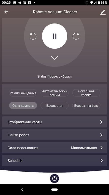 Приложение Smart Life предоставляет значительно больше функций, чем пульт управления или, тем более, единственная кнопка «Старт» на корпусе. С мобильного телефона мы можем не только запустить любой режим, проконтролировать работу прибора, установить нужную силу всасывания, но и увидеть текущий уровень заряда аккумулятора в процентах, заставить потерявшегося в квартире робота «подать голос» и посмотреть карту помещения, как она выглядит с точки зрения программы.