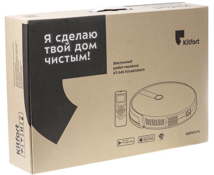 Коробка пылесоса, выполненная из коричневого картона, оформлена в фирменном стиле компании Kitfort: на лицевой стороне нанесено схематическое изображение прибора внутри с пультом дистанционного управления, название модели и слоган «Я сделаю твой дом чистым». Под рисунком мы также видим логотипы Google Play, App Store и значок Wi-Fi: устройством можно управлять как через штатный пульт, так и при помощи мобильного приложения.