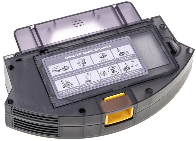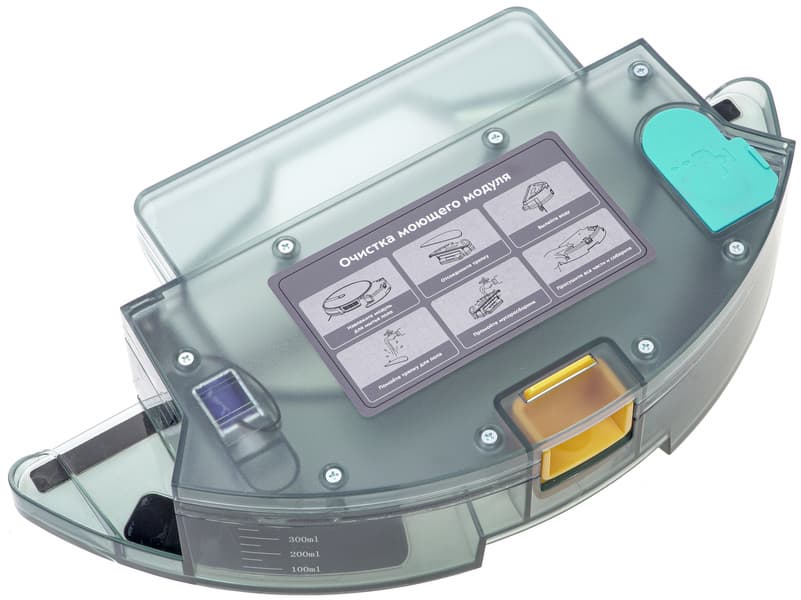 Модули пылесборника и влажной уборки взаимозаменяемы и имеют сходные конструкцию и внешний вид. На верхней стороне обоих нанесены инструкции по очистке: короткий текст и понятные, легко читаемые схематические рисунки. Оба модуля фиксируются в корпусе при помощи одинаковых защелок ярко-желтого цвета.