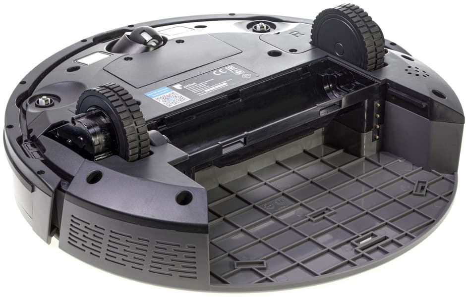 По обе стороны от направляющего ролика размещаются контакты для зарядки устройства на базе. Рядом с колесами, спереди и по бокам, есть парные окошки оптических (инфракрасных) датчиков поверхности, обеспечивающих безопасность устройства: они предотвращают падение с высоты на лестницах и подиумах и отключают движение робота при отрыве от пола. В передней части корпуса имеются гнезда для крепления боковых щеток, имеющие маркировку «L» и «R» (левая и правая слегка различаются направлением изгиба щетины, и путать их не стоит).