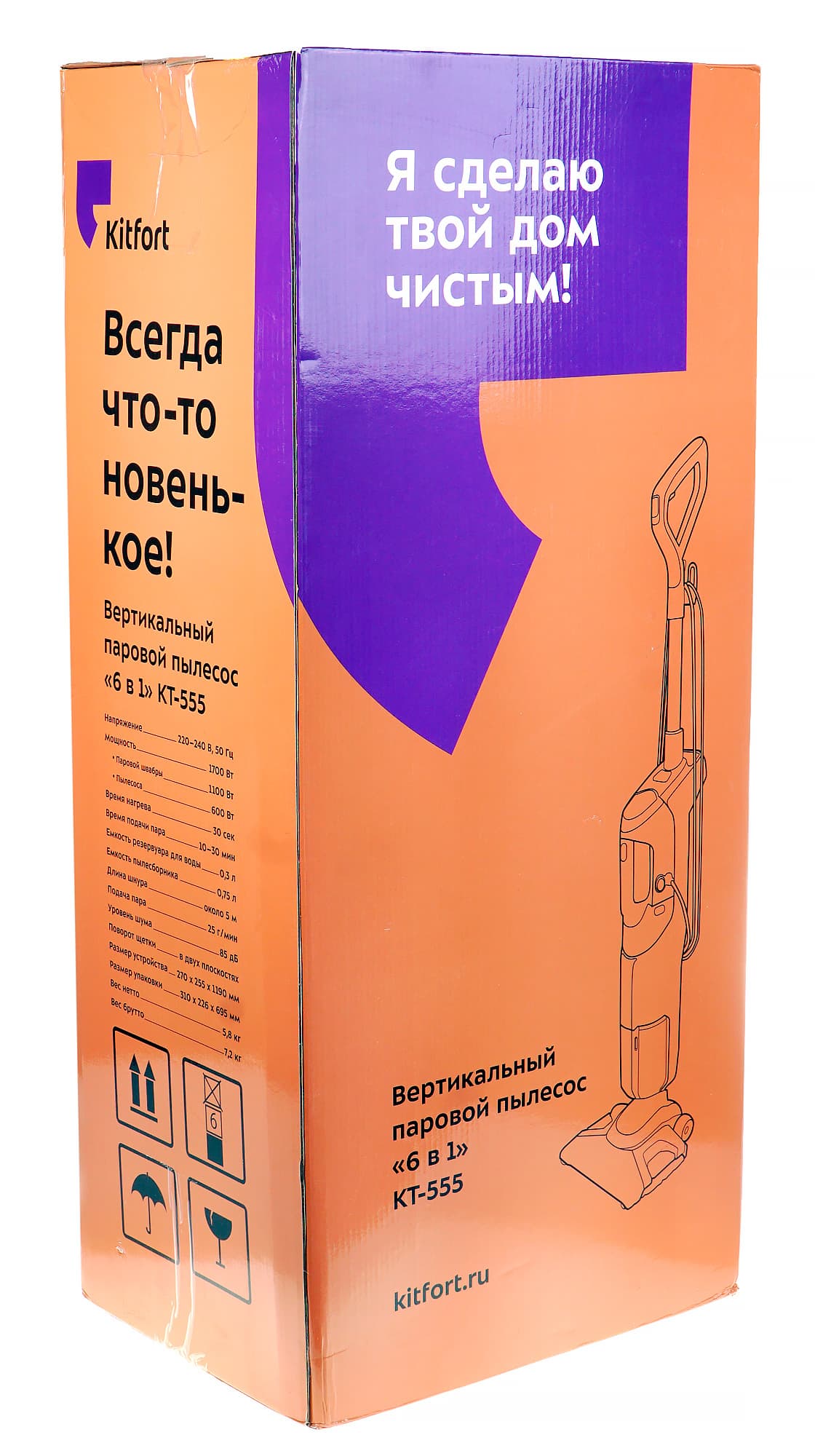 Коробка, в которой к нам приехал пылесос, сделана из глянцевого картона рыжевато-коричневого цвета в сочетании с фирменным фиолетовым. Kitfort последовательно продолжает придумывать к каждой модели свой девиз, и для KT-555 он таков: «Я сделаю твой дом чистым!»