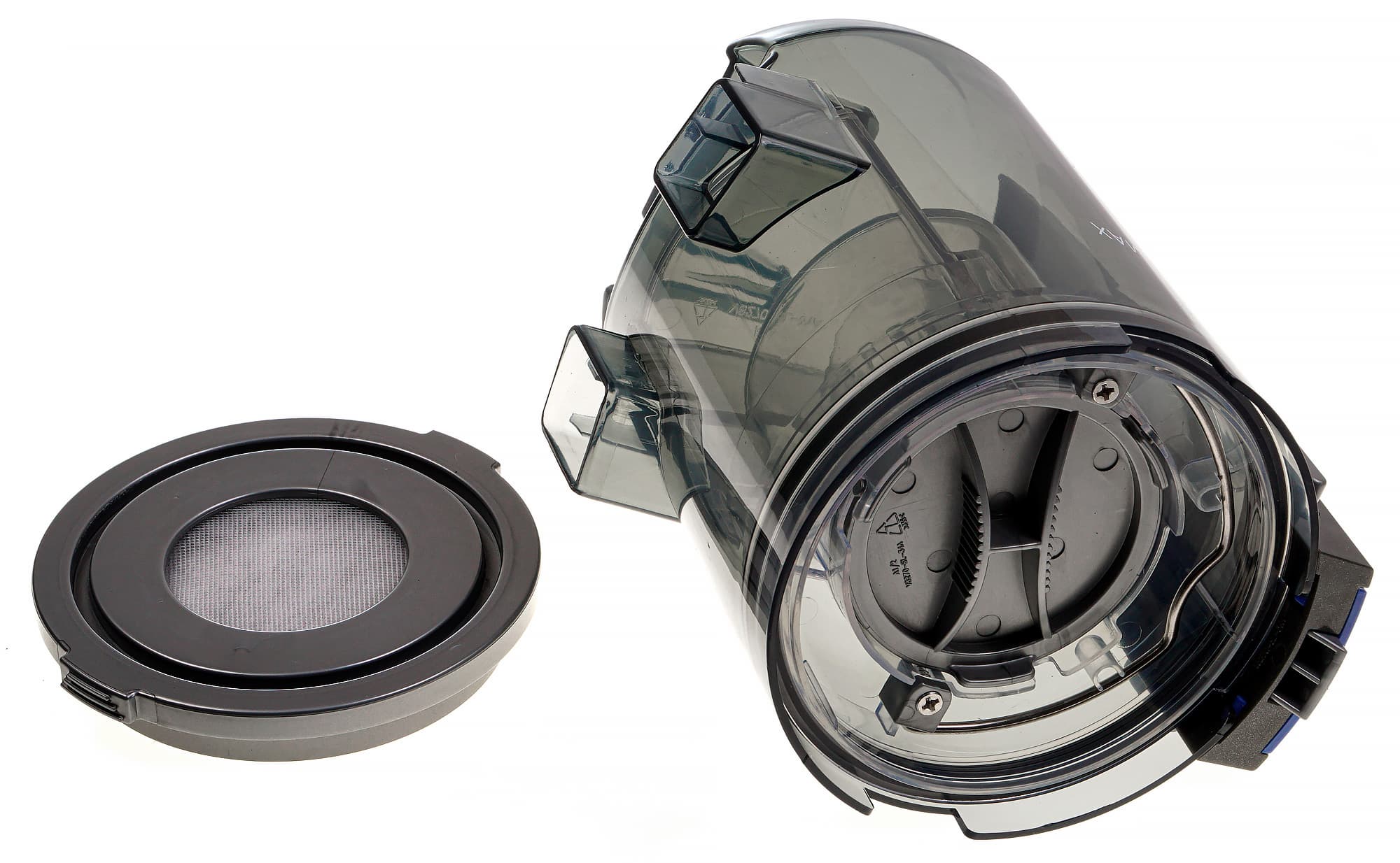 Фильтр грубой очистки представляет собой довольно простой по конструкции циклон из одного элемента. Он изготовлен из светло-серого полупрозрачного пластика, позволяющего контролировать заполнение емкости мусором. На верхней части фильтра расположена крышка для доступа во внутреннюю его часть. Из корпуса пылесборника фильтр извлекается за складную металлическую дужку.