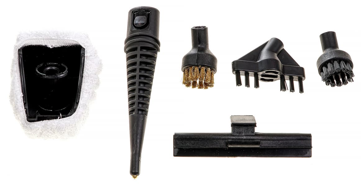 Комплектация насадок для пароочистителя более разнообразна: он поставляется с двумя круглыми щетками (нейлоновой и металлической), плоской нейлоновой щеткой для труднодоступных мест, насадкой для отпаривания (с тряпкой для отпаривания в комплекте), резиновым скребком для стекла, струйной насадкой и гофрированным шлангом.