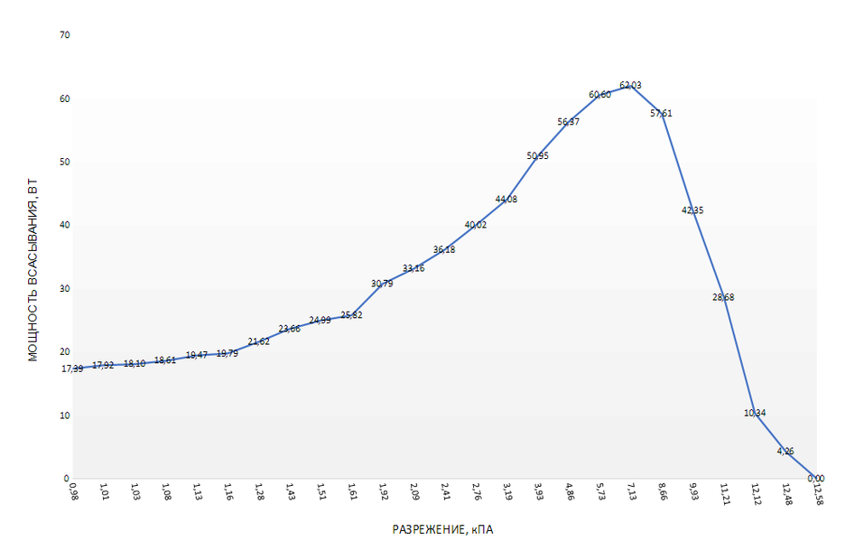 Мощность всасывания (что это такое и как мы ее измеряем, описано в отдельной статье) мы определяли при работе пылесоса без насадок. Зависимость мощности всасывания от создаваемого разрежения приведена на графике ниже: