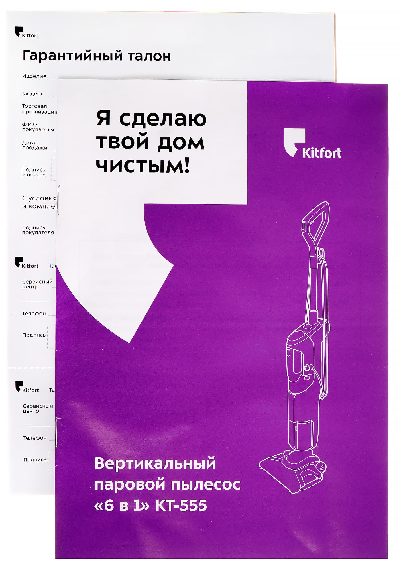 Брошюра в сиреневой с белым обложке содержит все нужное для того, чтобы начать пользоваться паровым пылесосом Kitfort KT-555. На обложке мы видим схематическое изображение пылесоса и слоган «Я сделаю твой дом чистым!» — точно так же, как на коробке.