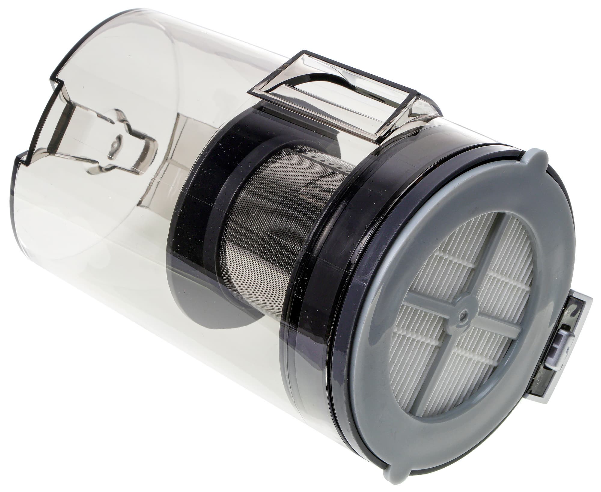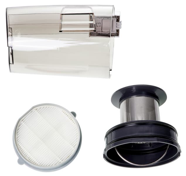 Мусоросборник выполнен из серого полупрозрачного пластика. В верхней части его цилиндрического корпуса находится система фильтрации, состоящая из циклона грубой очистки и HEPA-фильтра тонкой очистки.