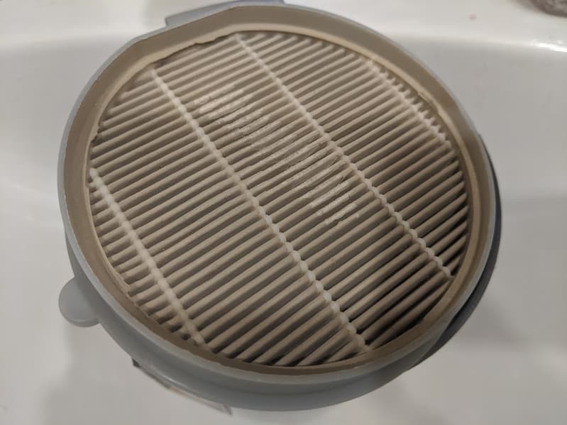 После циклонного поток воздуха с пылью попадает на фильтр тонкой очистки. Он также тривиален по конструкции и представляет собой «таблетку» из собранного в гармошку HEPA-фильтра. Он также держится в корпусе силой трения и не имеет дополнительных креплений.