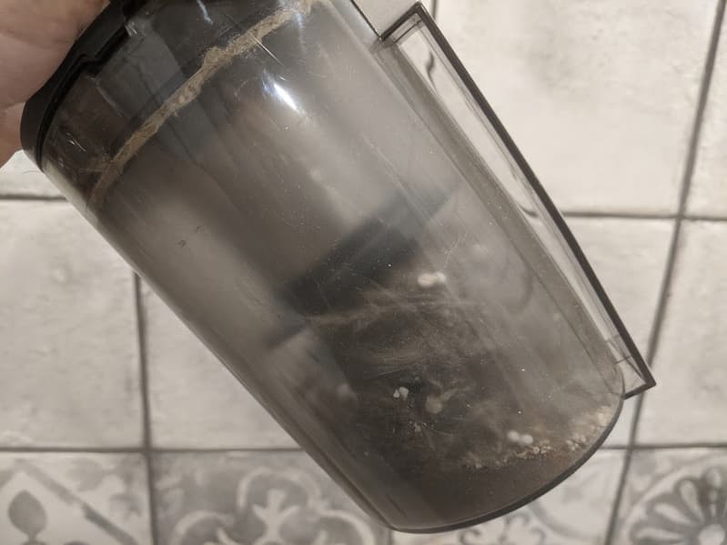 Мусоросборник удерживается защелкой за верх. Нижней частью он зафиксирован выступом на корпусе. Извлекается он без труда, а вот чтобы поместить его на место, приходится прилагать значительное усилие — и не всегда получается это сделать с первого раза.