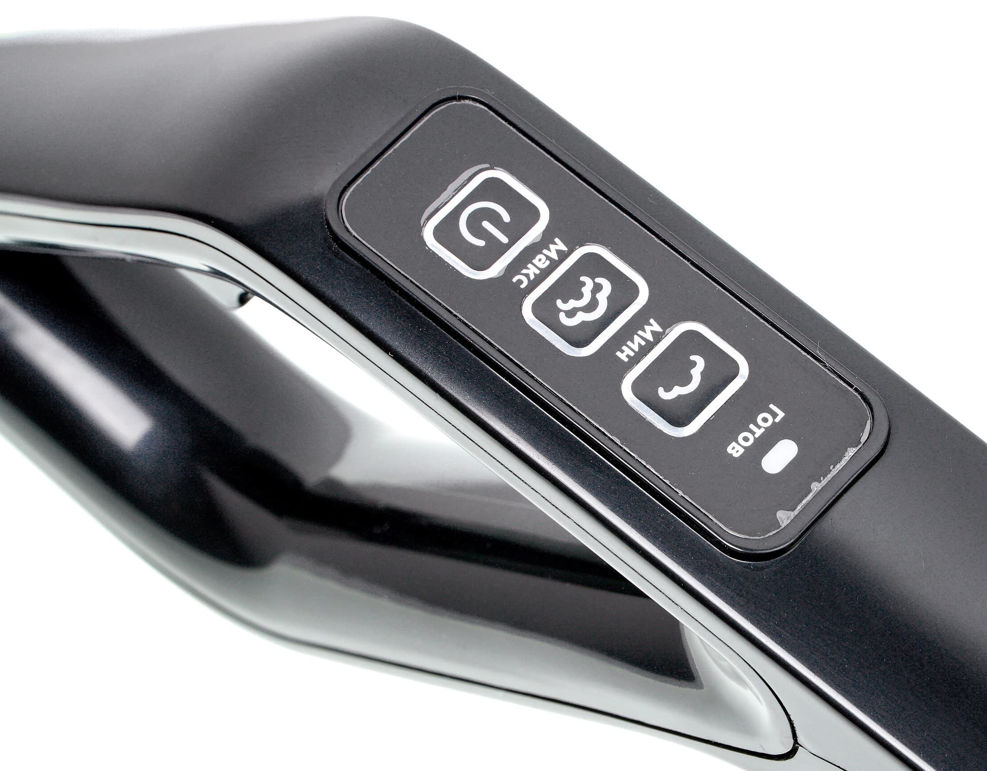 Черная пластиковая рукоятка устройства имеет форму параллелограмма. Удерживать пылесос нужно за верхнюю сторону, а на боковой, переходящей в удлинительную трубку, расположена панель управления. Курок, включающий подачу пара, находится на внутренней стороне, под указательным пальцем.