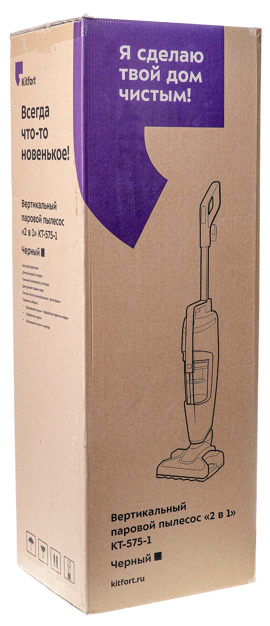 Пылесос KT-575 прибыл к нам в коробке, обычной для крупной бытовой техники компании Kitfort: упаковка из коричневого некрашеного картона с трехцветной, черно-бело-фиолетовой печатью.