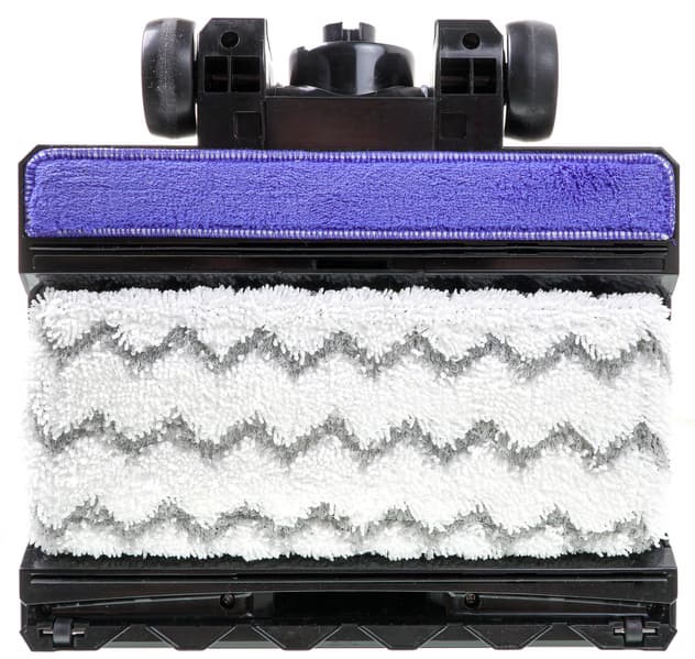 Дополнительная тряпка для собирания излишней влаги в задней части напольной насадки — еще одна особенность данной модели — работает отлично. Поначалу нам даже казалось, что парогенератор работает недостаточно интенсивно, но нет: лишняя влага остается на второй тряпке, а пылесос оставляет за собой не мокрый, как у большинства моделей этого типа, а лишь чуть влажный след.