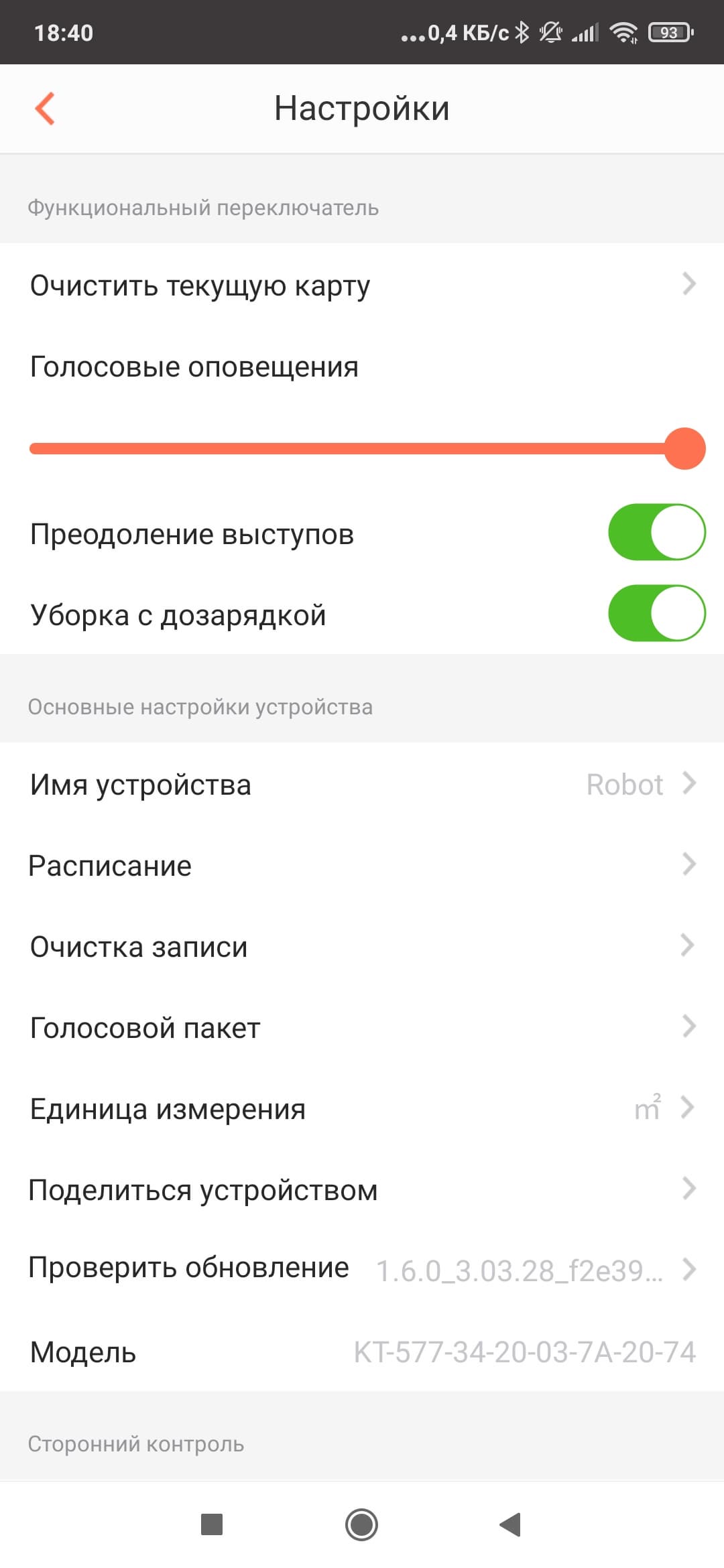 После успешного соединения появится вкладка с настройками, позволяющая получить информацию о пылесосе, обновить прошивку, предоставить другим пользователям доступ к прибору и т. п.