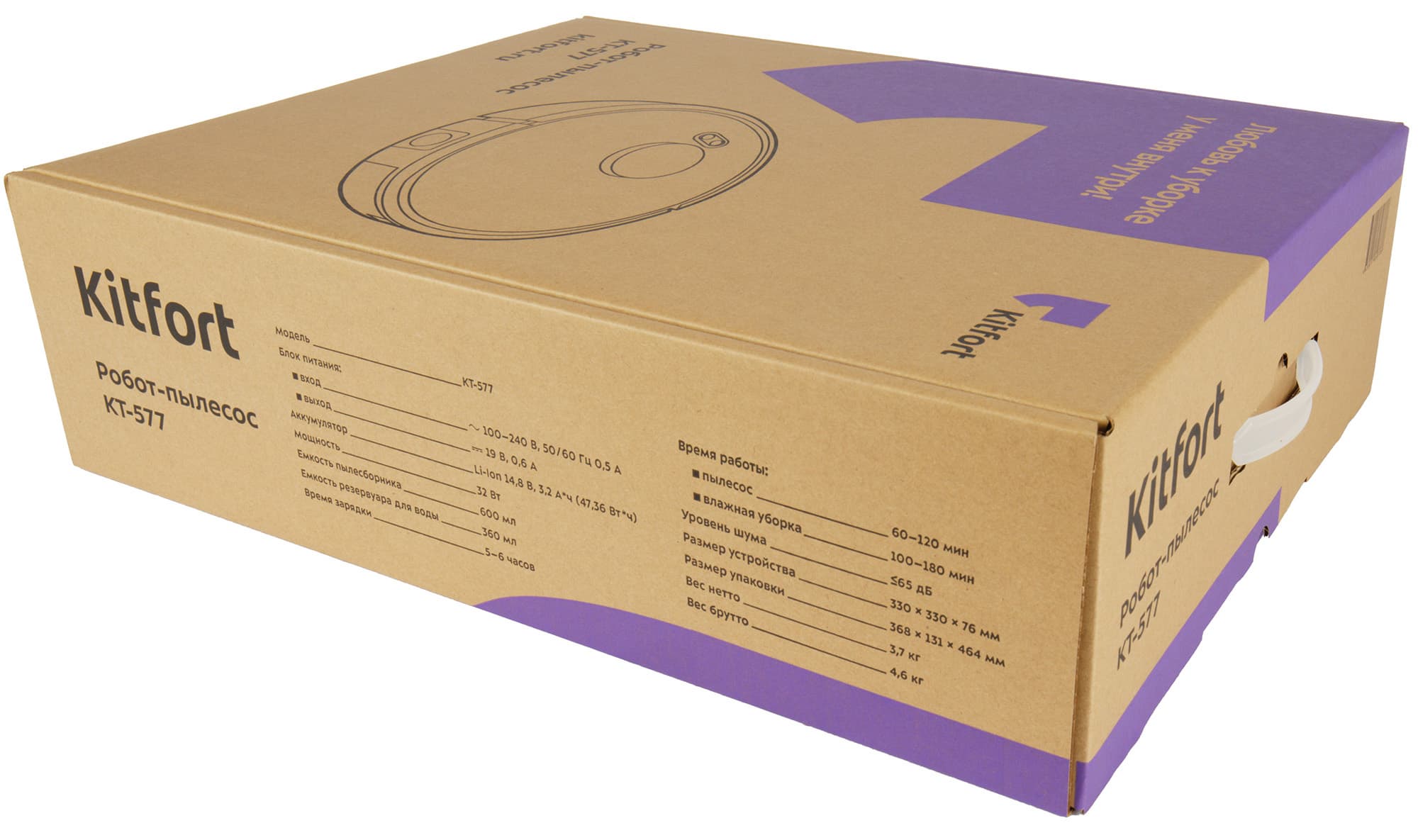 Внутренняя коробка, хоть и сделана из коричневого картона, является «парадной»: у нее есть пластиковая ручка для переноски, на самой коробке нанесено векторное изображение робота, а также отмечены его основные технические характеристики и достоинства.