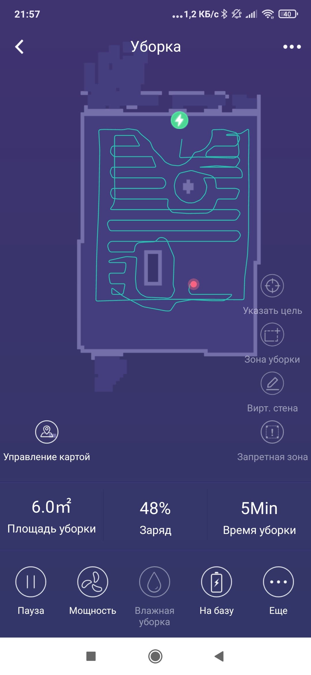 За первые 10 минут наш робот вышел на центр комнаты, осмотрелся, после чего обошел всю тестовую площадку, уверенно определив для себя маршрут уборки. Ни одна зона не была пройдена дважды, ни один угол не был пропущен. Исключение составляет, разве что, область около базы.