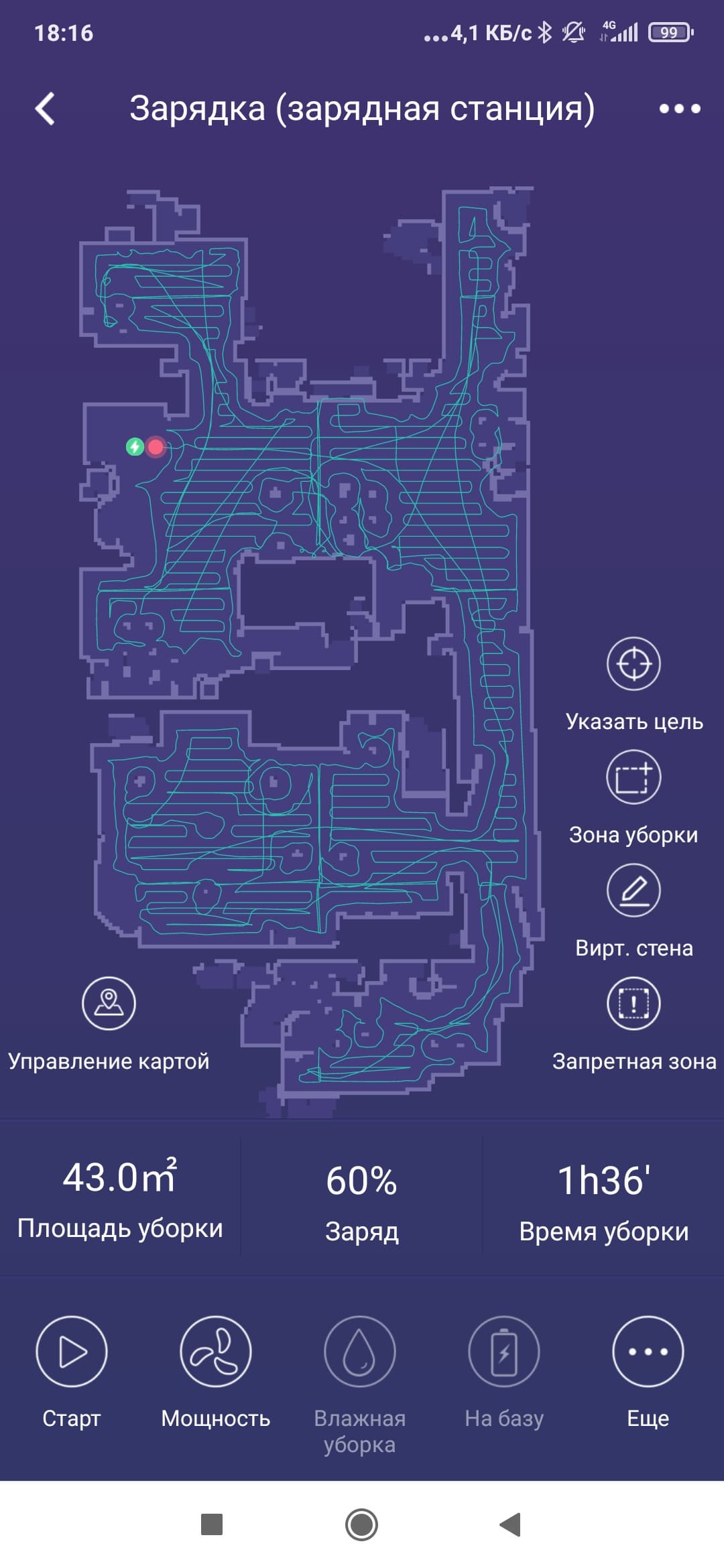 Пока робот заряжается, пользователь может рисовать прямо поверх карты — помещать виртуальные стены, либо самостоятельно обозначать зоны, требующие уборки.