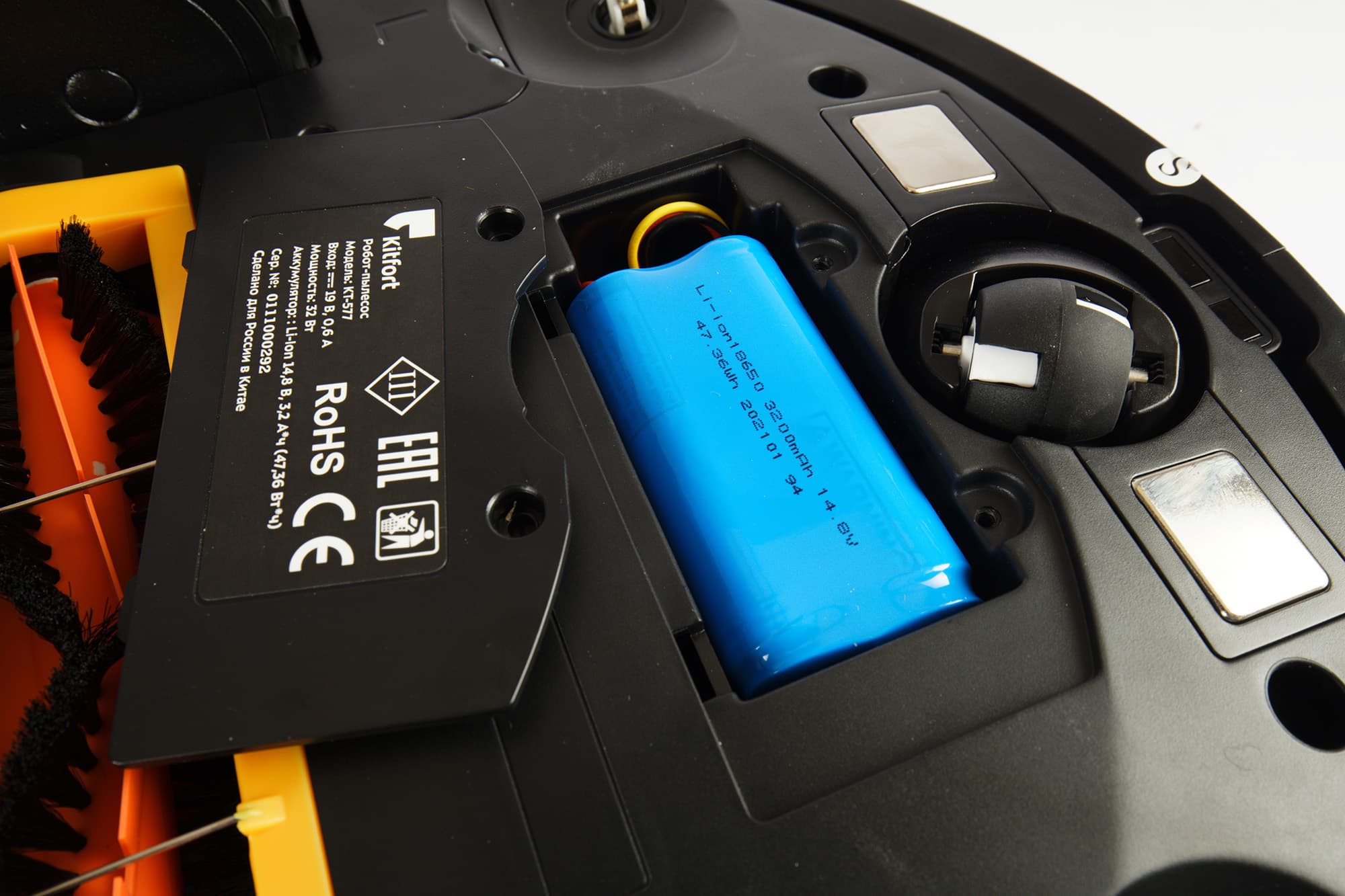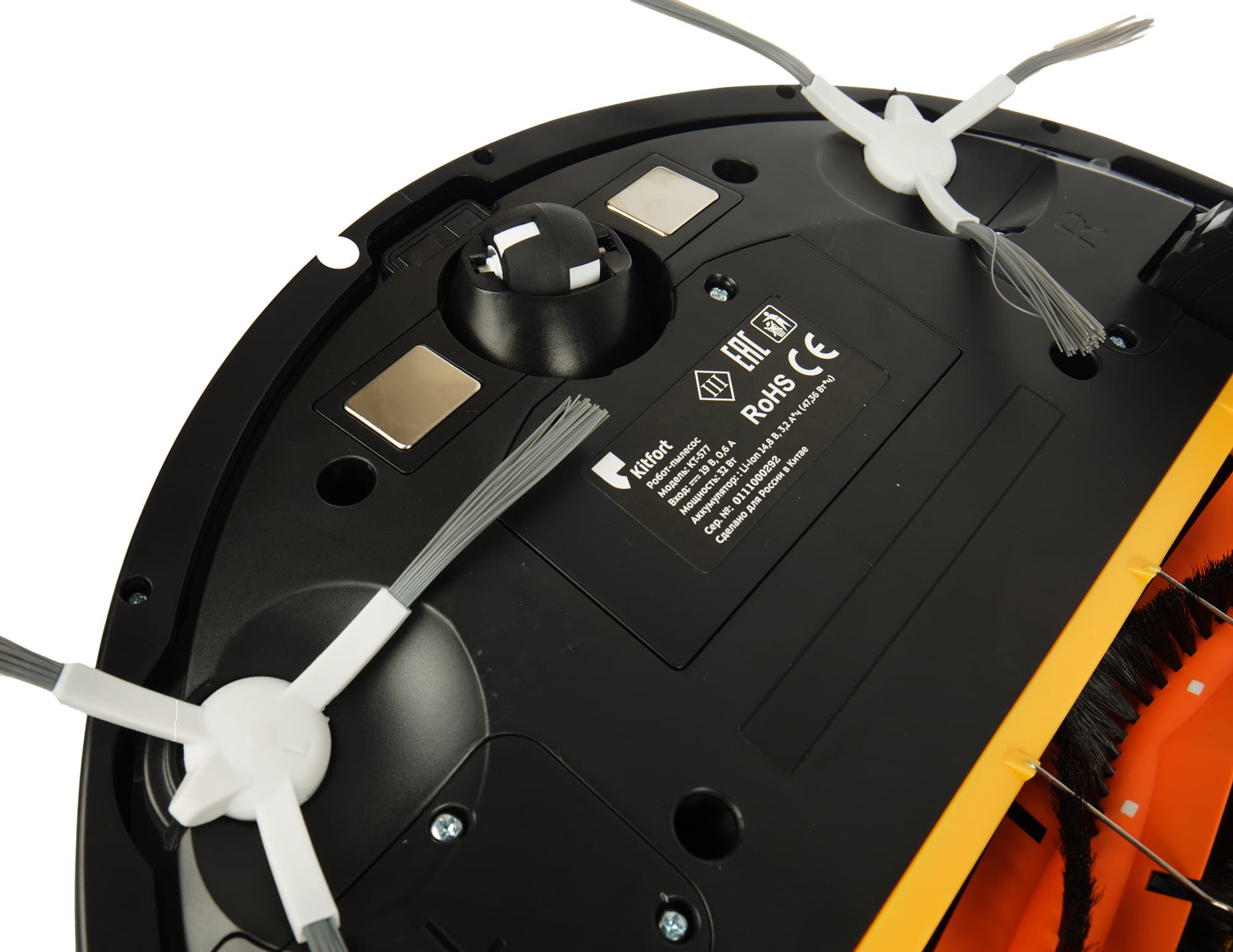 Направляющее колесо пластиковое. Оно заключено в пластиковую же сферу, допускающую свободное вращение на 360°. По обе стороны от колеса размещаются контакты для зарядки на базе. Также в передней части корпуса можно увидеть гнезда для крепления боковых щеток, а по центру и по бокам — окошки оптических (инфракрасных) датчиков поверхности.