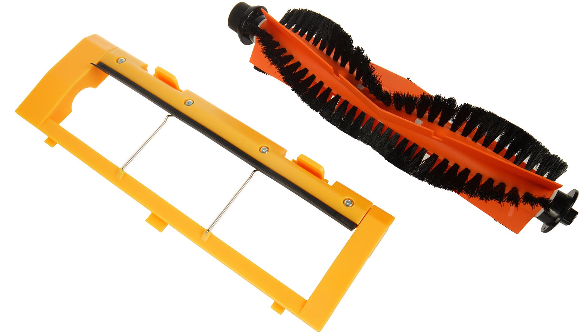 В центре нижней панели расположена основная электрощетка с V-образными резиновыми ламелями, чередующимися с рядами синтетической щетины. Фиксируется она обычной пластиковой рамкой с двумя защелками.