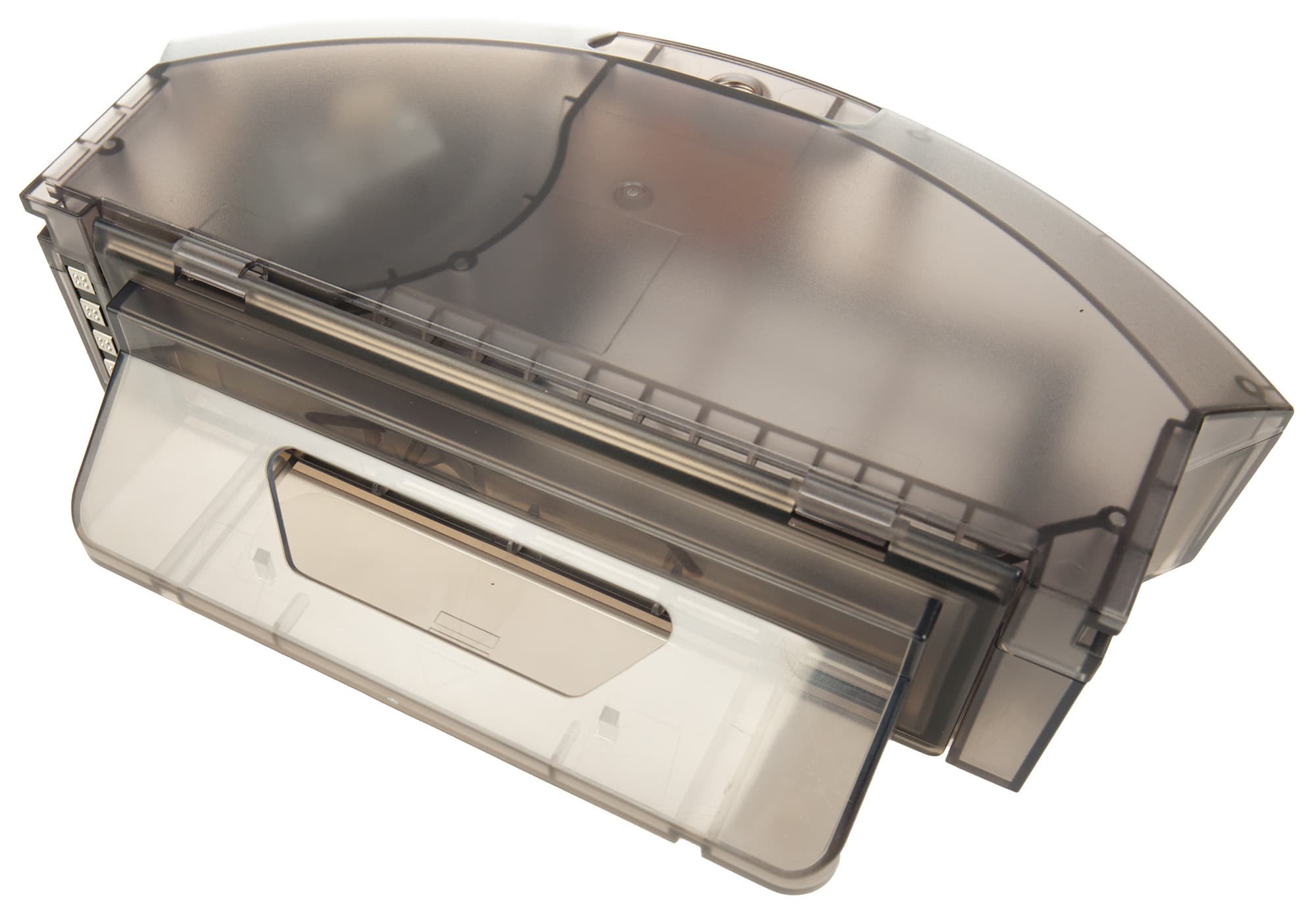 Откидная крышка фиксируется на защелке. На контейнере можно найти наклейку-подсказку с правилами очистки пылесборника, так что заглядывать в инструкцию лишний раз не придется.