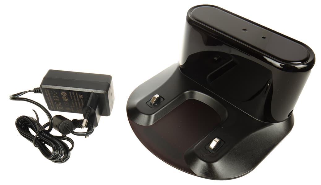 Заряжать робот можно как с помощью базы, так и подключив его к зарядному блоку напрямую. База сделана из ИК-прозрачного пластика, под которым стоят датчики, обеспечивающие позиционирование робота при возвращении на зарядку. У базы есть светодиод, сигнализирующий о ходе заряда батареи. Контакты подпружинены и имеют ход около 3 мм. Снизу у базы предусмотрены антискользящие наклейки.