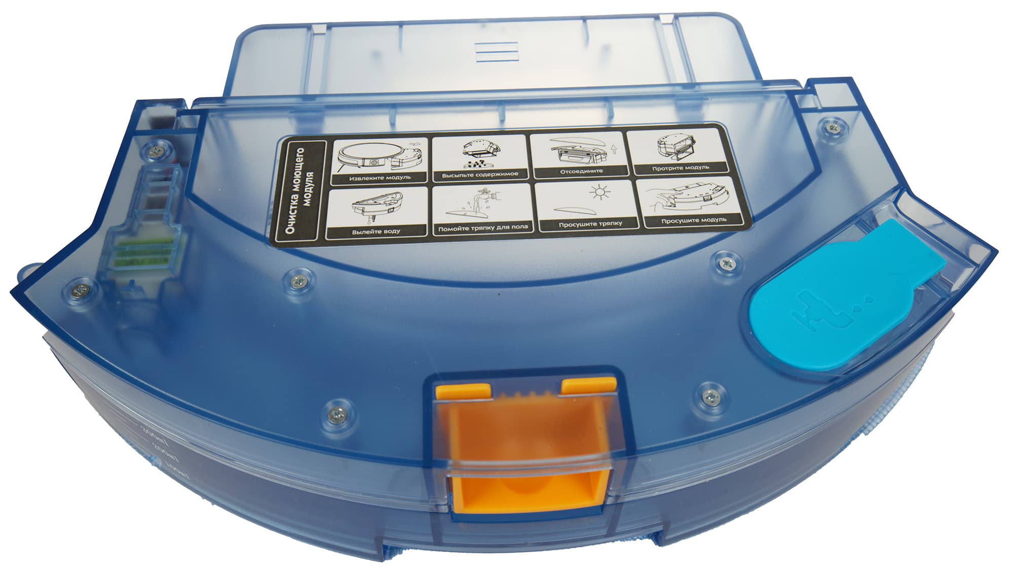 Микрофибровая тряпка фиксируется на модуле при помощи четырех довольно больших «липучек»-велкро. Сбоку на модуле мы видим градуировку, соответствующую 100, 200 и 300 мл. Сверху — наклейку, содержащую информацию об уходе за модулем.