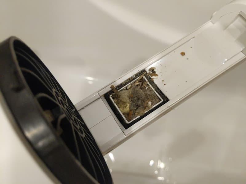 Инструкция не напрасно предупреждает нас о возможности засорения воздушных каналов: крупный мусор имеет склонность застревать в них. Если мощность всасывания заметно упала, а мусоросборник заполнен не целиком, есть смысл проверить весь тракт и при необходимости прочистить его. Делать это можно каким-либо длинным предметом — к примеру, карандашом или отверткой.