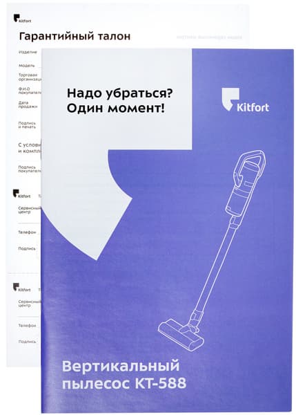 К пылесосу прилагается брошюра, оформленная в фирменном стиле производителя: бело-фиолетовая обложка со схематическим изображением модели, логотипом Kitfort и креативным слоганом.