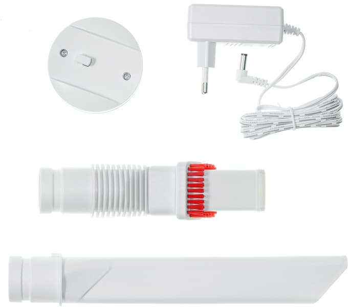 Неэлектрифицированные насадки простые, традиционные: Kitfort KT-588 комплектуется щелевым соплом и насадкой «2 в 1» с выдвижным щеточным элементом.