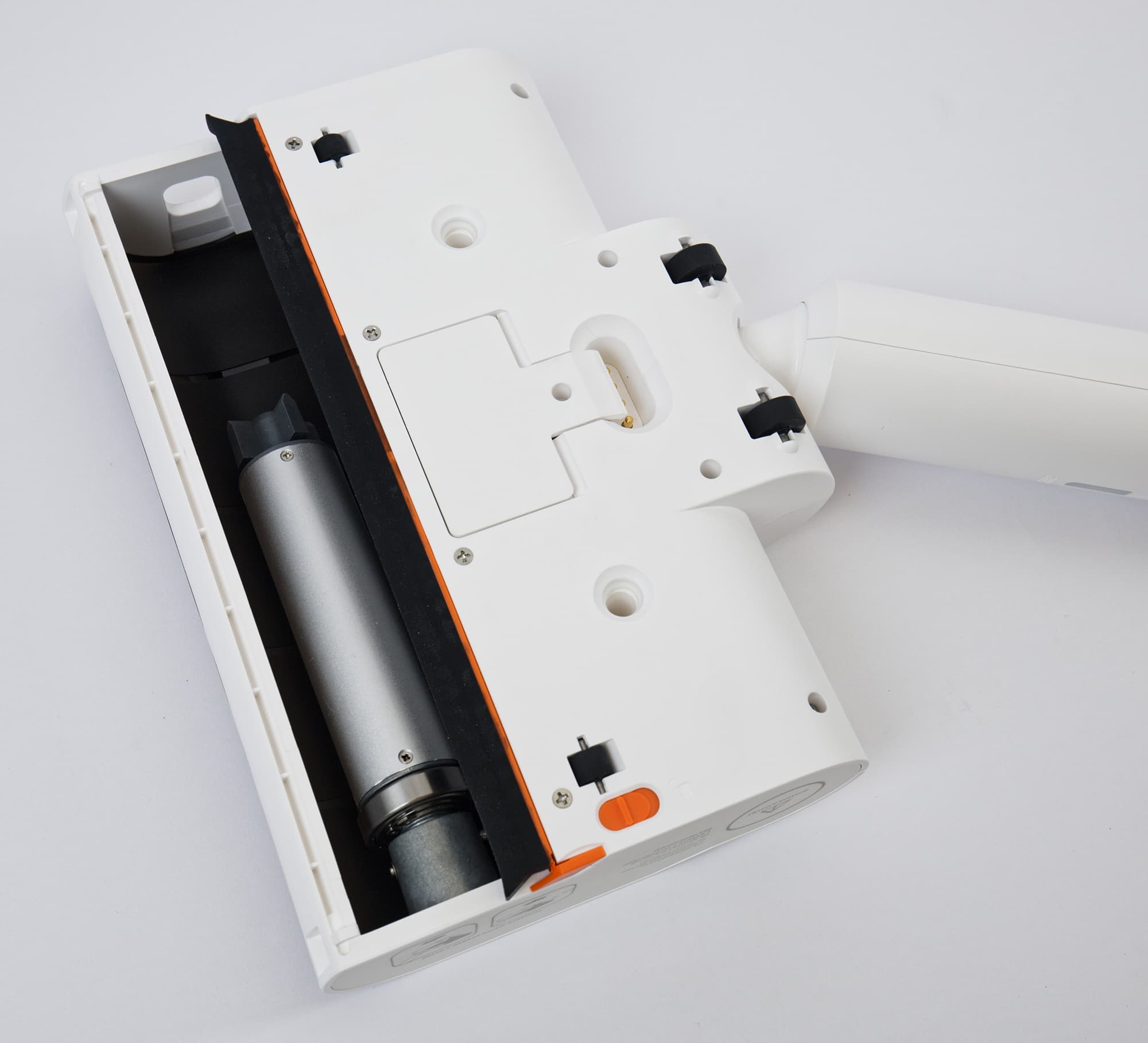 Переходим к сборке нижней части швабры — напольной щетки. Сдвигающим движением перемещаем фиксатор в сторону крышки и поднимаем ее. Далее надеваем маленький оранжевый подшипник на валик и затем, надеваем валик на мотор. На боковой части корпуса напольной щетки есть специальная прорезь для фиксации кнопки подшипника.