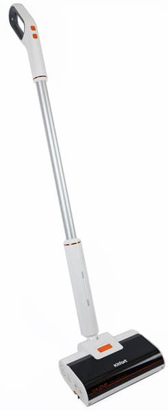 Шарнирное крепление напольной щетки к основному блоку позволяет легко проникать в труднодоступные места. Вес устройства при работе не ощущается вовсе, так как швабра сама едет вперед и нужно лишь слегка направлять ее в нужную сторону. Если отпустить ручку, она даже способна проехать по прямой без посторонней помощи до первого препятствия.