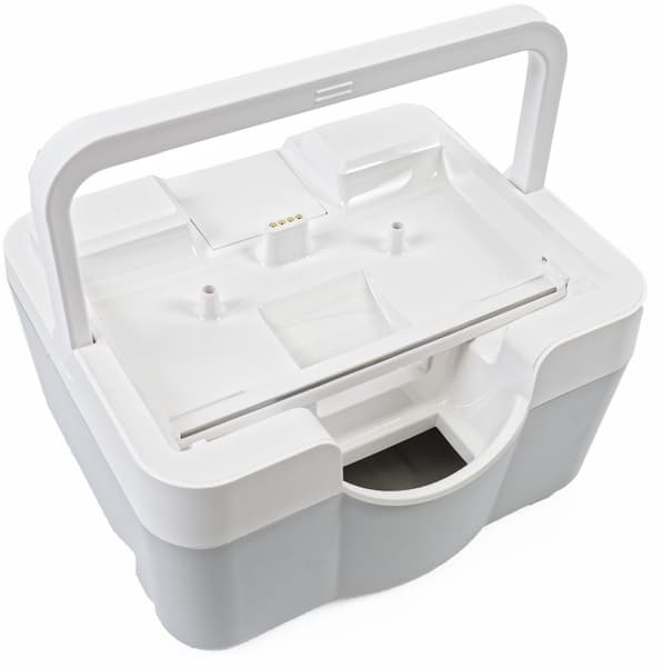 База электрошвабры представляет собой пластиковый бак с удобной ручкой для переноски в верхней части конструкции. Также наверху находится перекладина для отжима валика и отсек для слива грязной воды, внутрь которого устанавливается решетчатая корзина для крупного мусора. Рядом с ним — электрические контакты для зарядки.