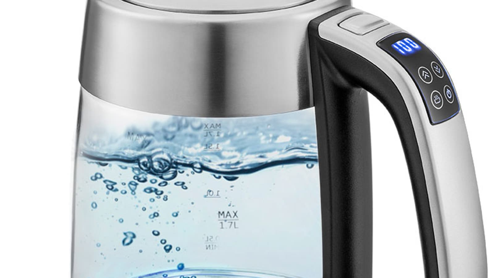 Колба у чайника сделана из стекла, сам он выполнен из пластика и нержавеющей стали. Внутри колбы можно увидеть термодатчик (он расположен на дне и выглядит как небольшой штырек). На колбе нанесены отметки Min и Max, соответствующие объему в 0,5 и 1,7 литра, а также промежуточные деления — 1 литр и 1,5 литра.