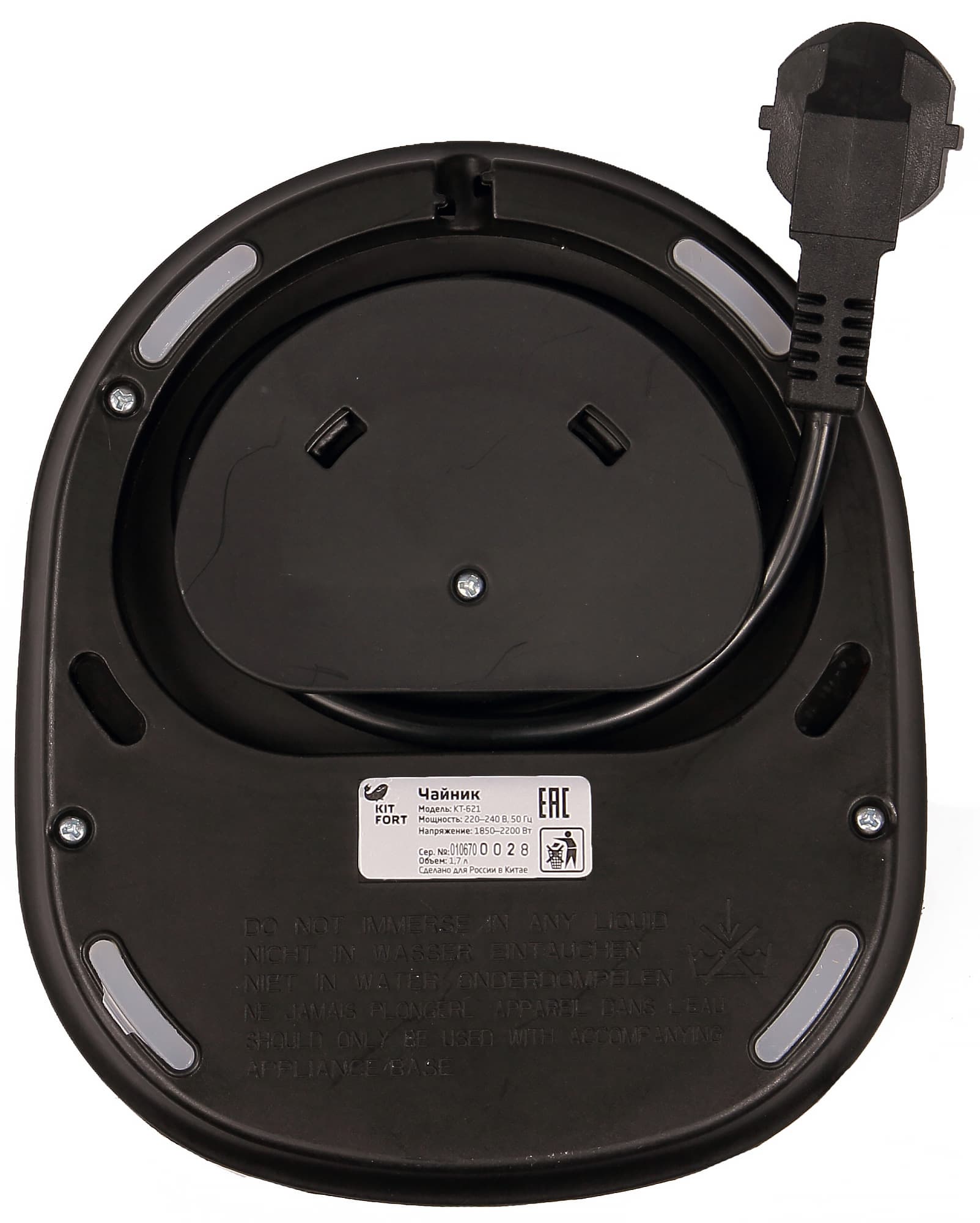 Контактная группа на днище чайника выглядит довольно прочной и допускает установку чайника в любом положении: его можно свободно вращать после установки на базу. Стоит отметить, что толщина концентрических металлических пластин, с помощью которых осуществляется «сцепление» чайника с базой чуть тоньше, чем может показаться на первый взгляд: если присмотреться, то можно увидеть, что их края слегка выгнуты наружу. Очевидно, об «экономии на материалах» тут речи не идет: такая особенность присуща многим чайникам, и, видимо, является оптимальной для обеспечения наилучшей устойчивости. Подача электроэнергии осуществляется через два контакта: центральный штырь и внешнее кольцо.