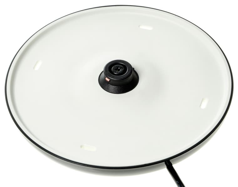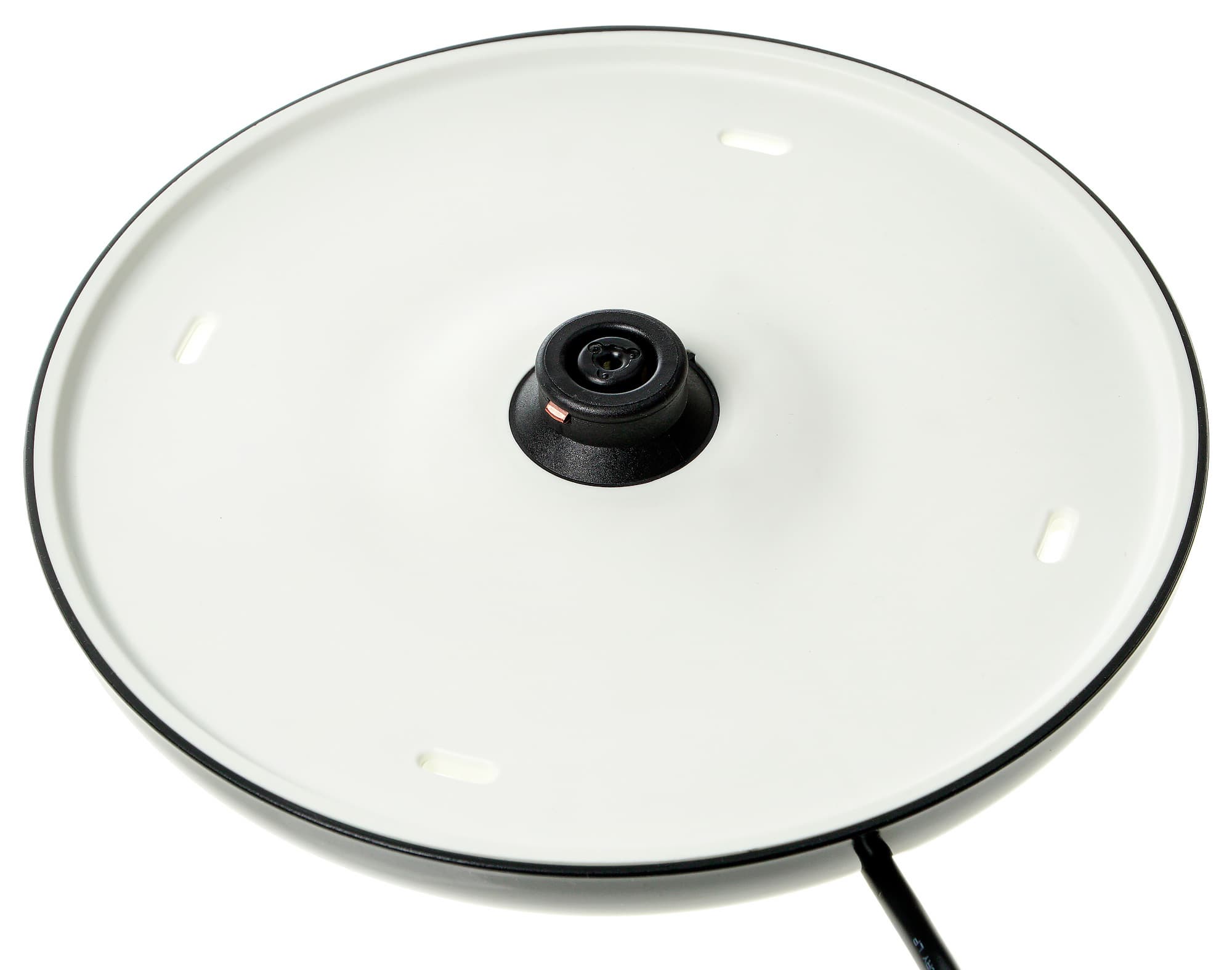 Нижняя часть корпуса у нашего прибора — пластиковая, того же цвета, что и керамика корпуса. Под ручкой расположена клавиша включения с красным светодиодным индикатором внутри — это единственный элемент управления. Тэн чайника — скрытой конструкции, расположен он под металлической пластиной серебристого цвета.