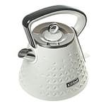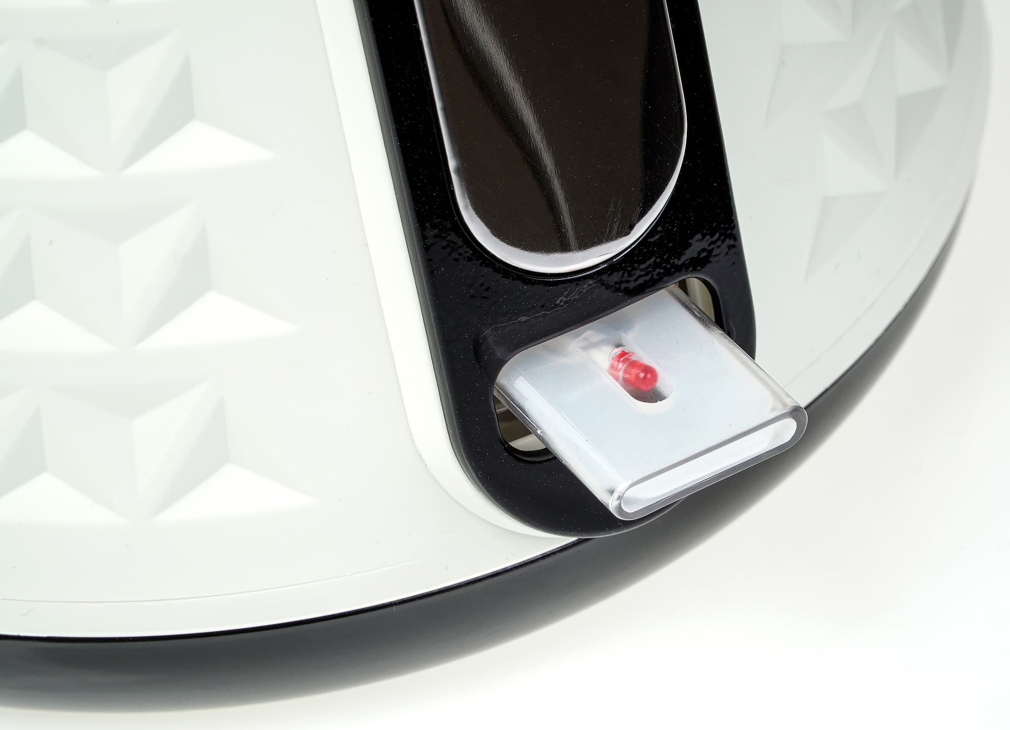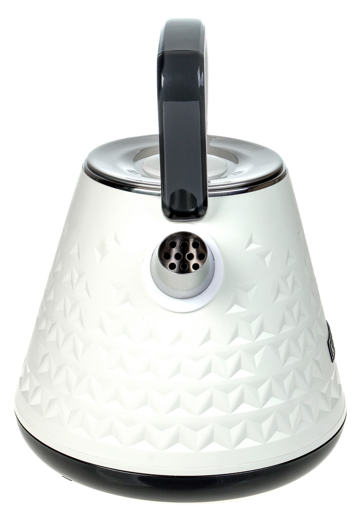 Наружное покрытие чайника выполнено из белого пластика (согласно сайту производителя, эта модель имеет и другие цветовые решения) с декоративным тиснением в виде треугольников разного размера. Носик чайника сделан из нержавеющей стали, внутри него размещена довольно крупная решетка, имеющая скорее декоративную функцию: полноценным фильтром для воды чайник не оборудован и решетка может «фильтровать» воду только от крупных предметов, по случайности попавших внутрь.