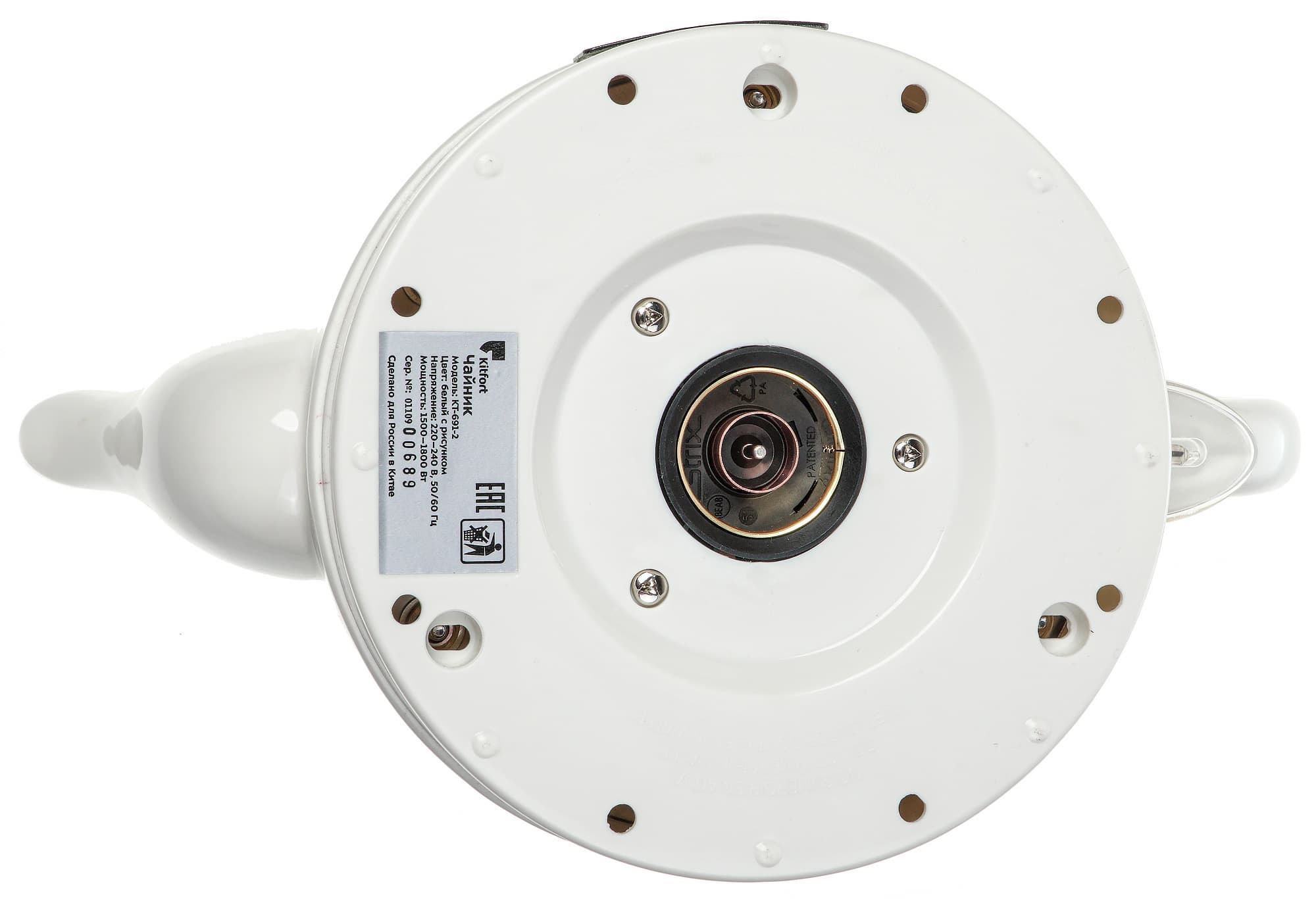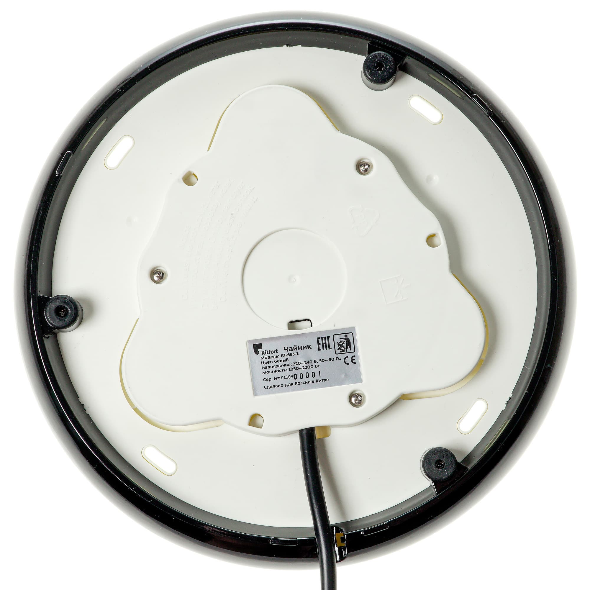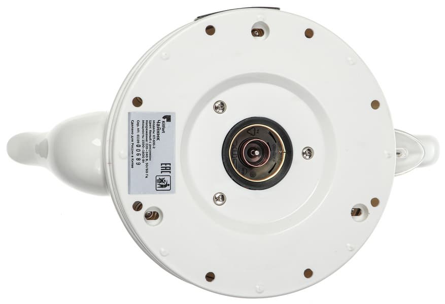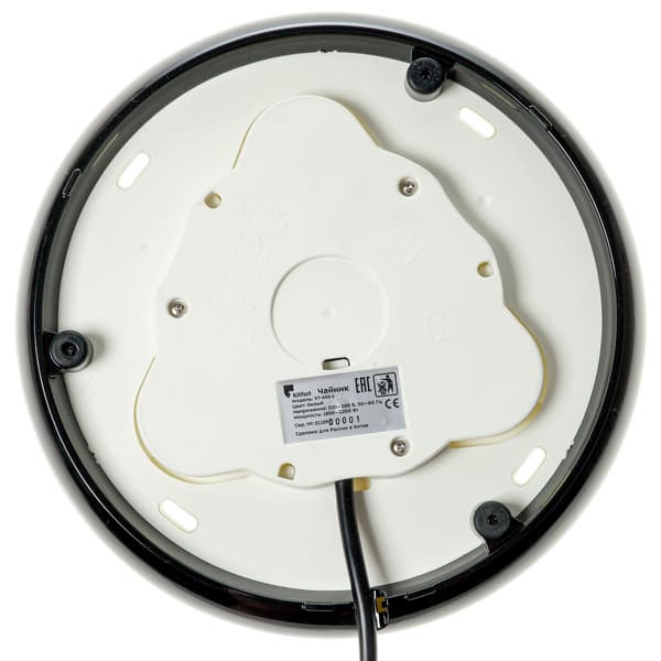 Нижняя сторона чайника предсказуемо проста — круглый разъем для подключения базы и шильда с названием модели, техническими характеристиками, серийным номером и информацией о стране производства.