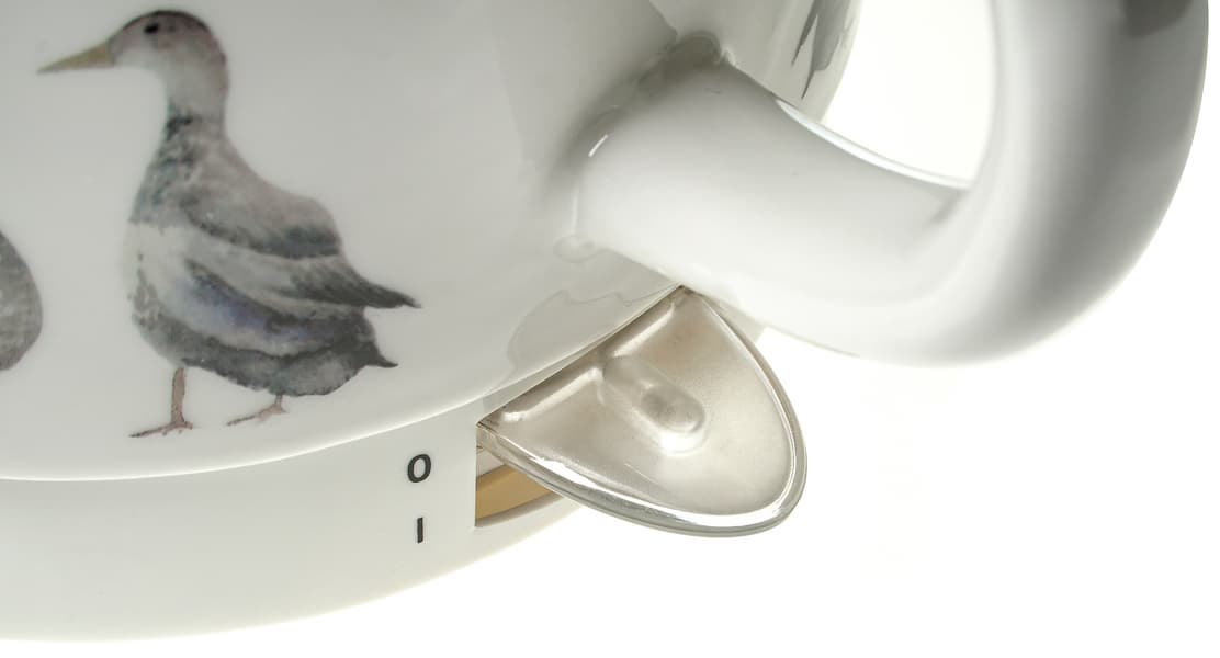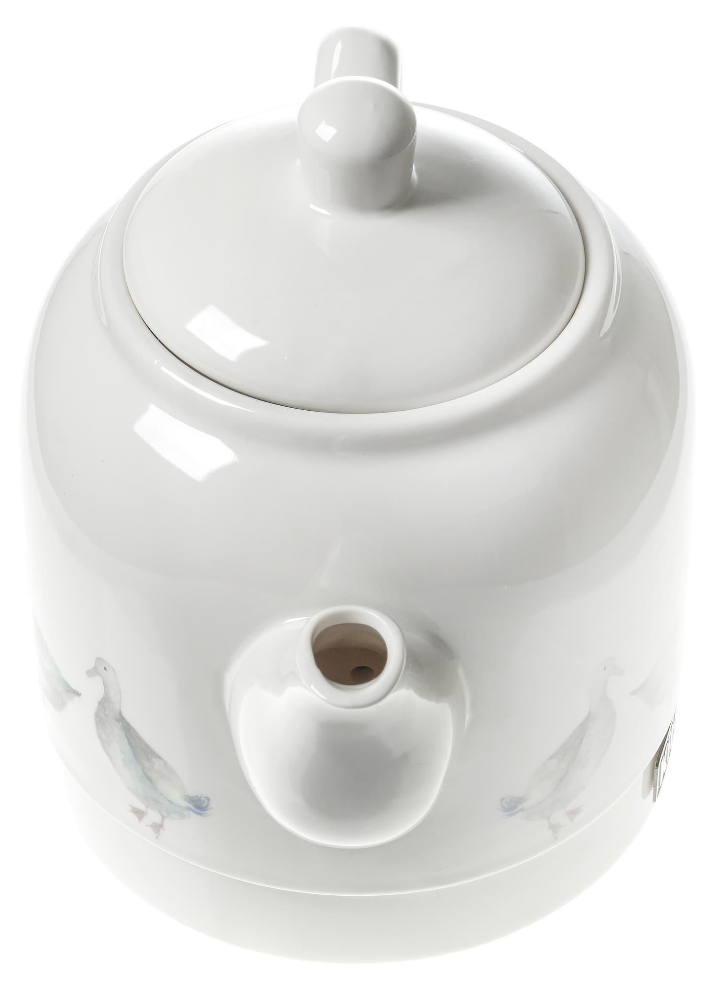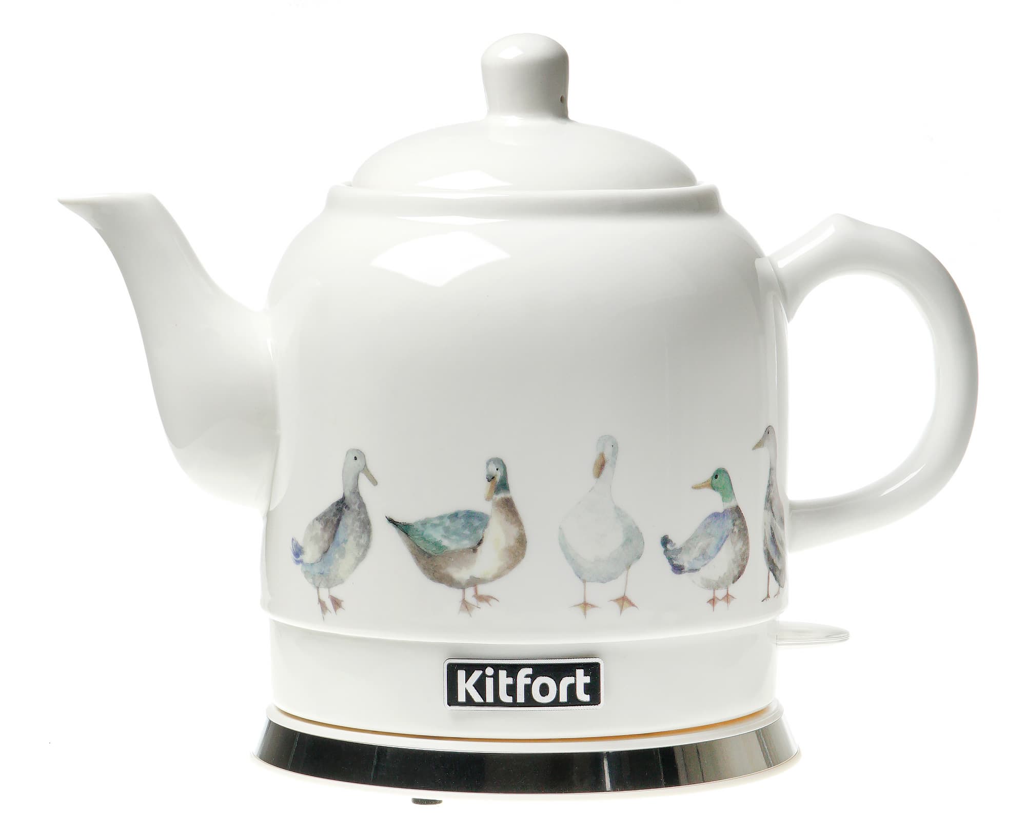 Керамический корпус чайника, попавшего к нам на тестирование (KT-691-2), украшен декоративной печатью — на обеих сторонах изображены водоплавающие птицы. Для тех, кто не любит уток или предпочитает бытовую технику без рисунков, компания Kitfort предлагает белый, без декоративного оформления, вариант этой же модели.