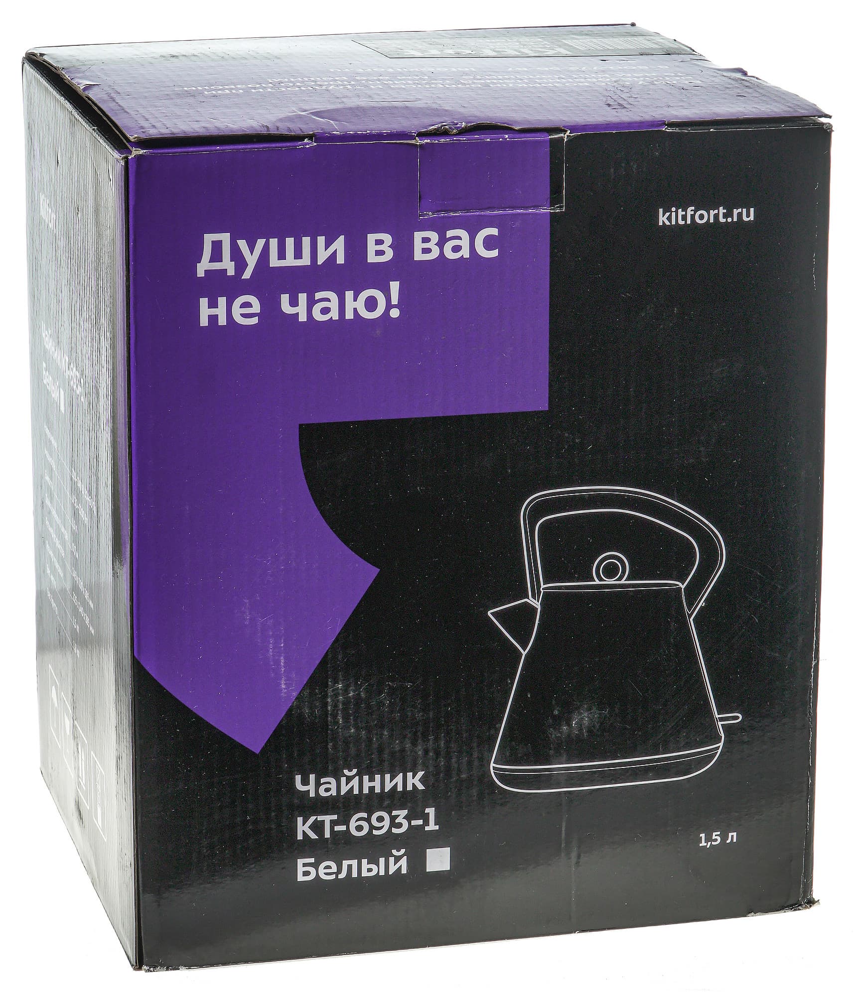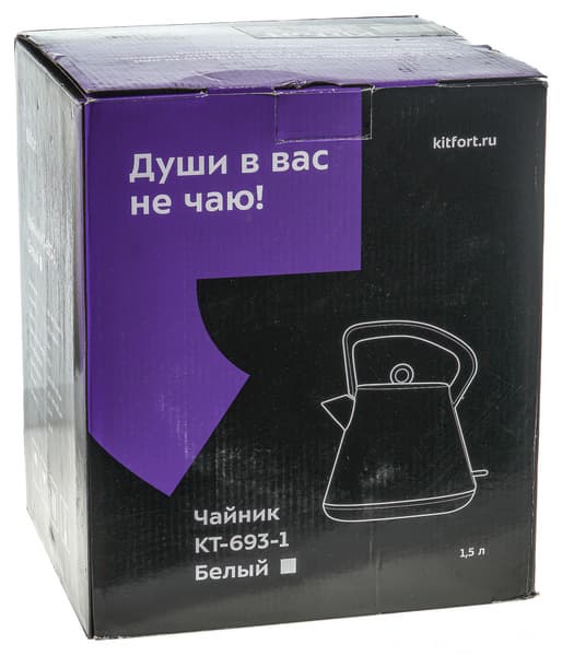 Картонная коробка чайника имеет стандартный для компании Kitfort дизайн: выполнена она в фиолетово-черной гамме с белым шрифтом.