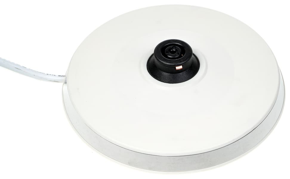 База чайника имеет классические конструкцию и размер. Выполнена она из того же белого пластика, что и низ корпуса самого чайника, и украшена декоративным пояском из металлизированной пластмассы. Нижняя часть базы может использоваться для хранения излишка сетевого шнура.
