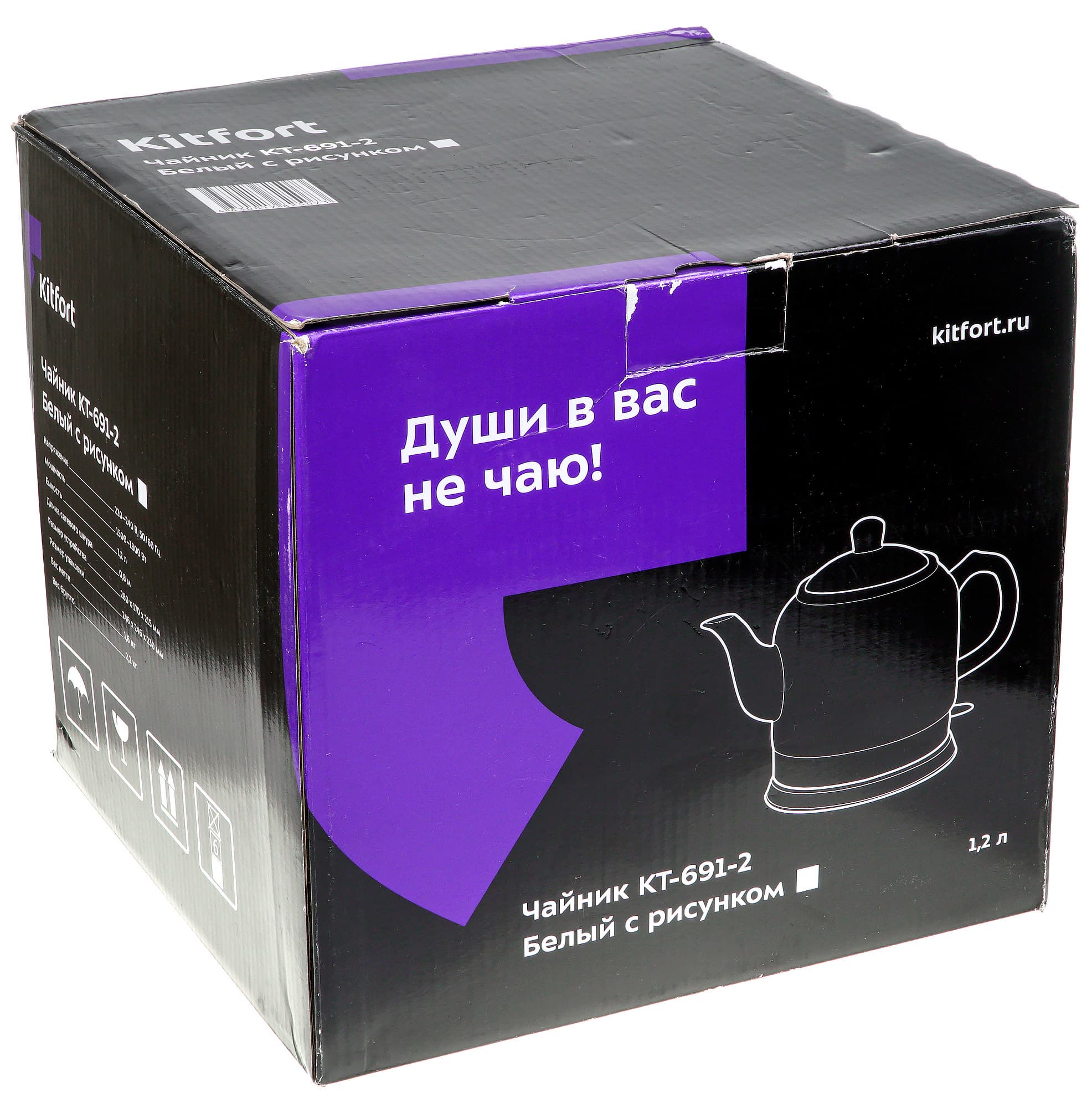 Коробка с чайником KT-693 слегка отличается от описанной выше коробки KT-691 только размерами (у этой модели коробка чуть больше), изображением модели на лицевой и обратных сторонах и техническими характеристиками, напечатанными на боковых сторонах.