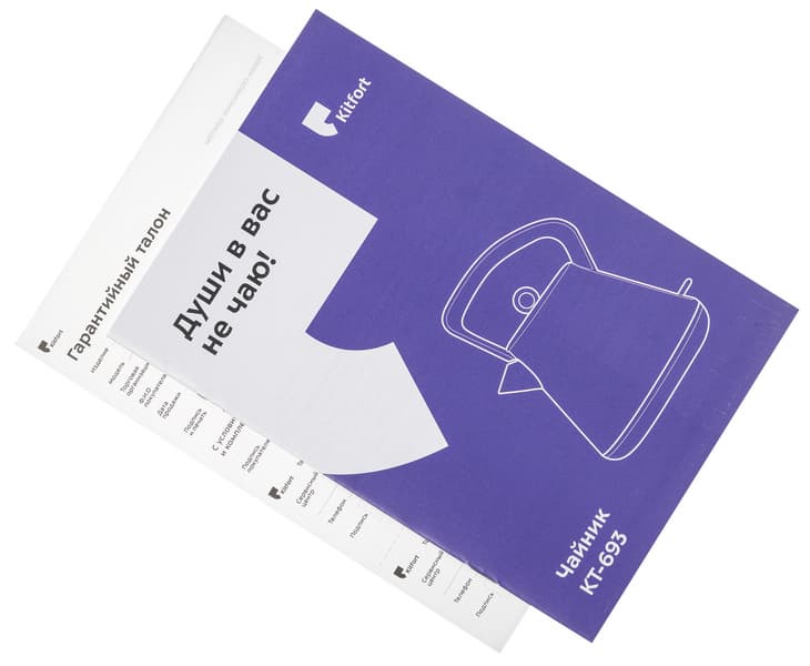 Маркетологи Kitfort любят использовать для своей продукции забавные слоганы. Для электрических чайников, рассматриваемых нами сегодня, они придумали сразу два, разместив их на разных сторонах коробки: «Души в вас не чаю!» на лицевой и «Чай, не пропадешь!» — на задней. Один из этих слоганов имеется и на обложке инструкций к каждому прибору.