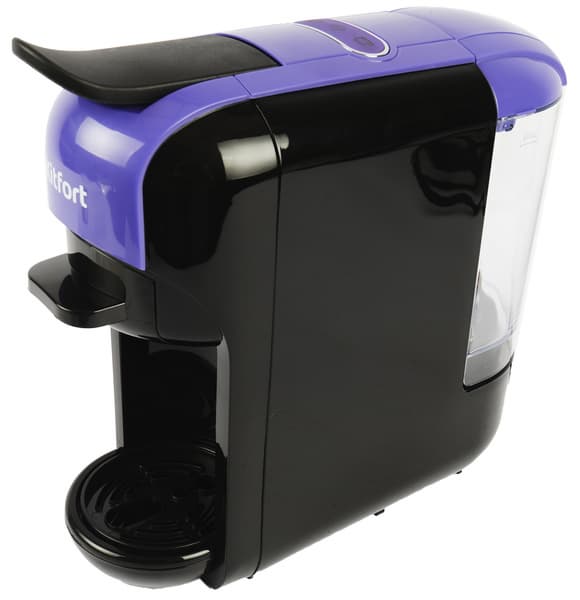 Визуально кофеварка производит более чем приятное впечатление: нам понравился и внешний вид, и качество сборки, и общий дизайн устройства. Корпус прибора сделан из черного глянцевого и фиолетового пластика. На вид перед нами, конечно, не прибор премиум-класса, но вполне достойный гаджет, который будет удачно смотреться как дома, так и в офисе или переговорной комнате. Сразу отметим единственную визуальную претензию — цвет пластика верхней панели и крышки бака для воды слегка различаются. Это, конечно, мелочь, однако внутренний перфекционист не может не отметить такую нестыковку.