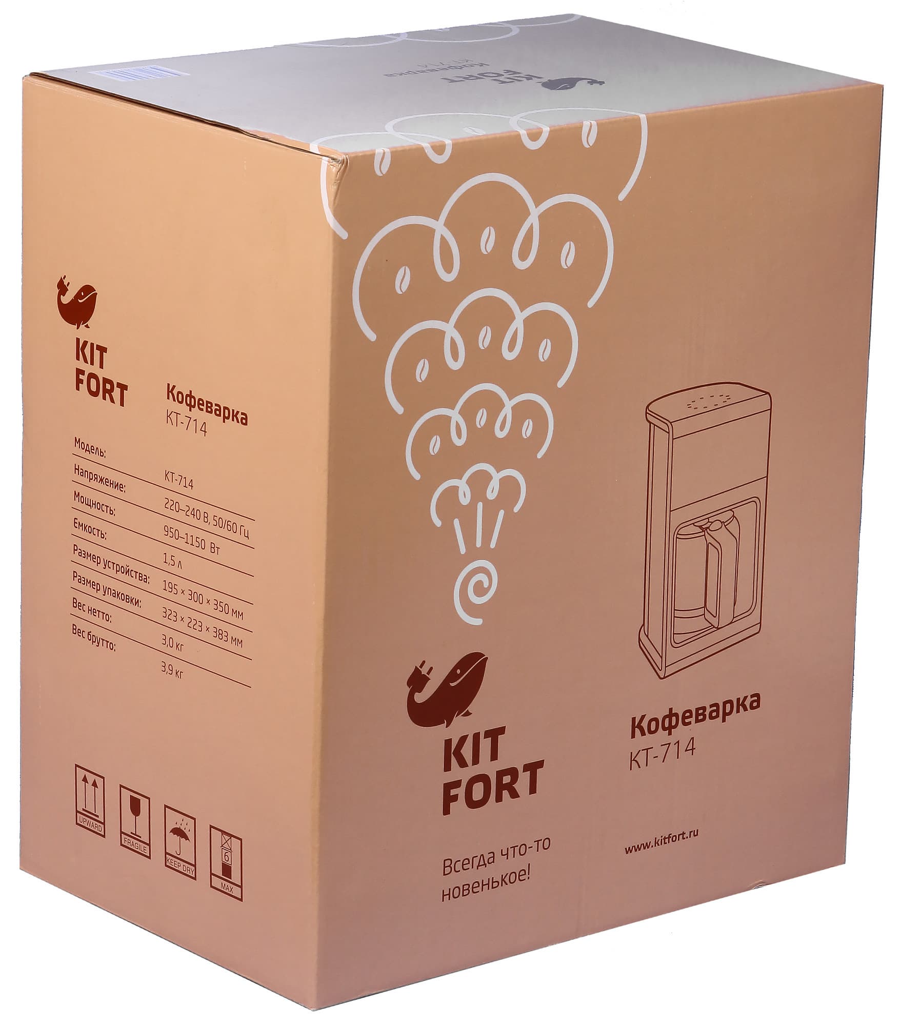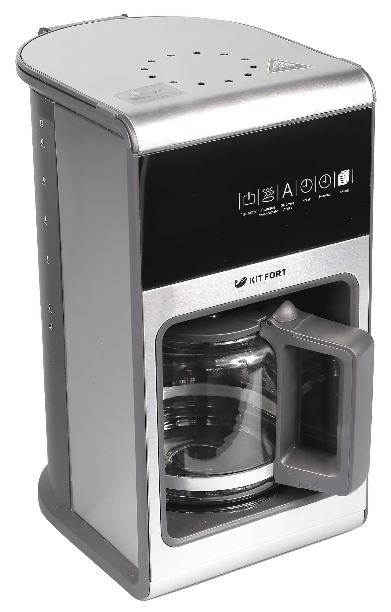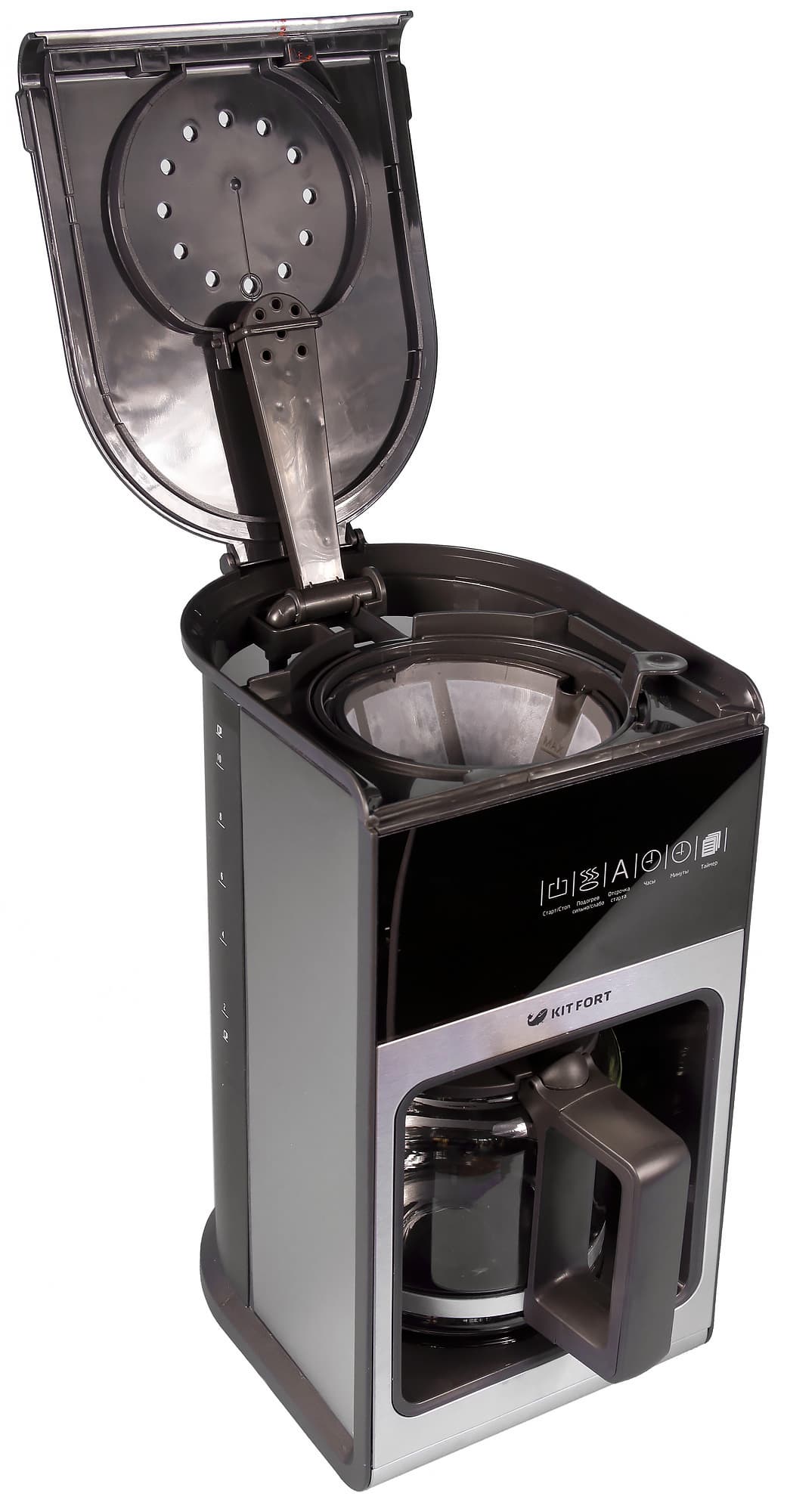 Герой нашего сегодняшнего обзора — капельная кофеварка Kitfort KT-714 — недорогое и симпатичное устройство с функциями отсрочки приготовления и автоподогрева.
