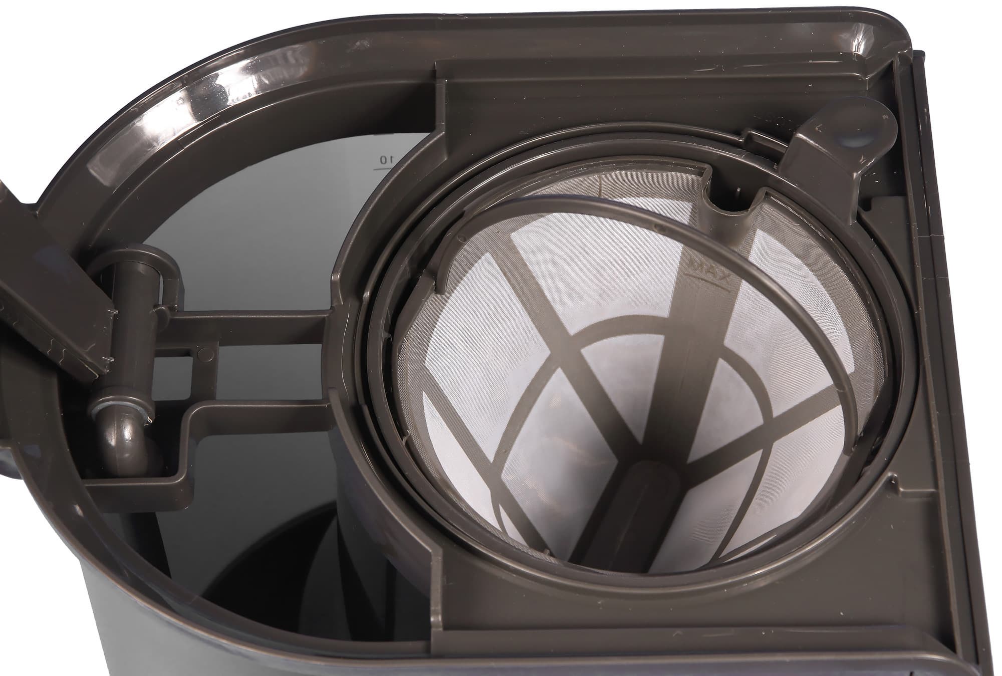 Стеклянный кофейник оснащен пластиковой ручкой и пластиковой же открывающейся крышкой. На стенке кофейника нанесена градуировка, соответствующая 2, 4, 6, 8 и 10 чашкам кофе. Воспользоваться другой емкостью вместо штатного кофейника не получится: его крышка нажимает на клапан антикапельной системы, включая тем самым подачу готового напитка.